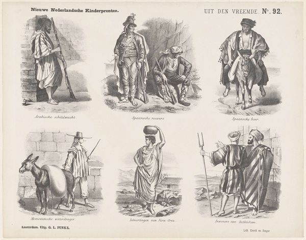 Curator: This print, created between 1865 and 1875, is entitled "De Turken in hunne huishouding" by George Lodewijk Funke, an intriguing lithograph showcasing various aspects of Turkish life. Editor: The composition's captivating, it is reminiscent of a sampler or a study sheet, offering fragmented glimpses into another world— a window into Ottoman life as perceived through a Western lens. The monochromatic medium renders a sense of austerity to otherwise embellished forms and details. Curator: Absolutely. What interests me here are the labor practices behind printmaking and how such accessible formats shape public opinion. Here we see varied illustrations of different figures and classes, seemingly compiled to offer viewers a comprehensive understanding of Turkish culture. Note also how mass-produced lithographs could distribute ideas about foreign cultures in ways never previously imagined. Editor: And the titles of each of the little portraits and vignettes – "The Sultan's Favorite," "A Tunisian," "The Grand Lord of the Sultan"– feel almost like collected specimen in an anthropologist’s notebook; removed and carefully re-presented for outside scrutiny. It's like flipping through an old photo album that whispers secrets. Curator: Exactly, there is also some ambiguity embedded within the text. It appears this image was purposed as a Dutch "Kinderprenten," a children's print which highlights its integration into the culture. Editor: That gives me pause— these "children’s prints" are infused with so much assumed Western superiority of the East. But somehow, even with my critical reservations, I'm still drawn to these images; especially by the delicate craftsmanship used to depict detailed elements of a distant world. The charm in the old-fashioned presentation seduces me every time. Curator: Yes, the format itself reveals much about 19th-century European perspectives on other cultures, revealing the material and cultural networks in which it circulated. Editor: The dialogue is not really just about those Turks and "their household" on that distant faraway land as the title suggests, is it? But it is also about how we viewed them— and thus viewed ourselves in relation to them. Interesting stuff.