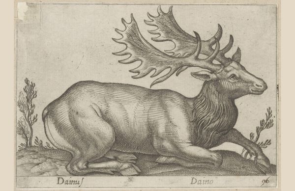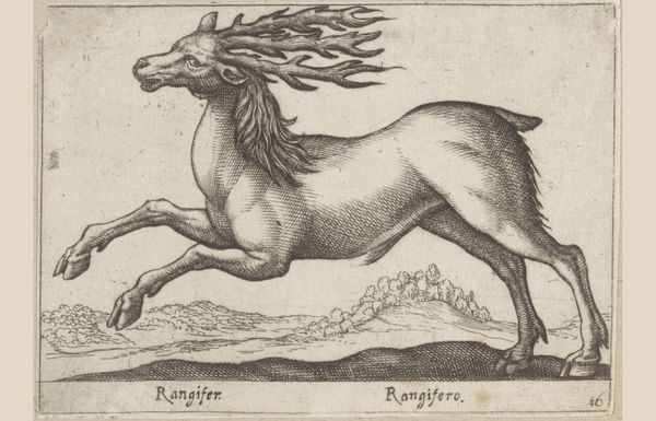 Curator: Alright, let's dive into this intriguing print—a work entitled "Damhert" by Antonio Tempesta, dating back to before 1650. It's currently housed at the Rijksmuseum, crafted through engraving, among other techniques. And, it presents a spotted deer. Editor: My initial impression? Energetic! But almost comically awkward too, in its frenzy. The deer seems caught between elegance and total panic. Those strangely spotted flanks though... I don’t quite get what the spots are about. Curator: The stippling really does give it an unusual texture. Considering Tempesta's era, he likely wasn’t going for photorealistic detail. The spots could function symbolically – a kind of marker denoting the deer's wildness, perhaps, or alluding to themes of hunting. Or they might represent the ephemeral quality of life itself, who knows? Editor: Hmmm… or just imperfections. Let's examine the composition. The deer occupies most of the frame, yet the simple landscape asserts itself at the bottom. See how that horizontal emphasis contrasts with the animal’s dynamic diagonals? Curator: I appreciate how the stark black and white amplifies that feeling of motion—that anxious leap. It’s so different from say, a lush, colourful painting of the same subject. This feels urgent, less about beauty, more about primal instinct. What does that background tell us about its environment and behavior, do you think? It is all line, form and minimal shading and contouring? Editor: Barely sketched-in vegetation, isn't it? Functional but, yeah, pretty spartan. The landscape isn’t really meant to define its habitat but more of the general landscape tradition than a particular location, which pulls our focus right back to the figure of the deer itself. I agree about that heightened immediacy with the linework! It accentuates that frantic quality. Curator: In our age, with such polished ways to show wildness, its fascinating to go back to something so unvarnished and visceral. Makes me consider the layers of artifice we build into modern visual storytelling. Editor: Absolutely! Analyzing Tempesta’s choices in this print lets us perceive these deeper dimensions in familiar images. This piece, though simple, really pushes us to contemplate how visual choices affect meaning. Curator: Indeed. A baroque deer dashing through time to give us some food for thought!