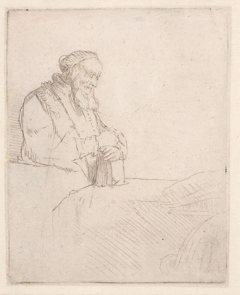 Rembrandt van Rijn rendered this image with etching. The composition is sparse, dominated by delicate, precise lines that coalesce to depict the profile of an old man. The texture varies from the dense hatching that defines the contours of his face and beard, to the lighter strokes suggesting his garment, creating a compelling contrast. Rembrandt's technique here reflects an exploration of form and the semiotic potential of line. Each stroke functions as a sign, contributing to a complex network that constructs the image of aging and introspection. The bald head, with wisps of remaining hair, destabilizes conventional notions of beauty and challenges viewers to find value in the unconventional. Consider the gaze averted, a simple yet profound element that encourages reflection on the passage of time. The lines, seemingly simple, function as a cultural code inviting ongoing interpretation.