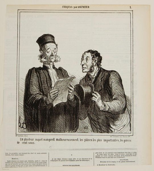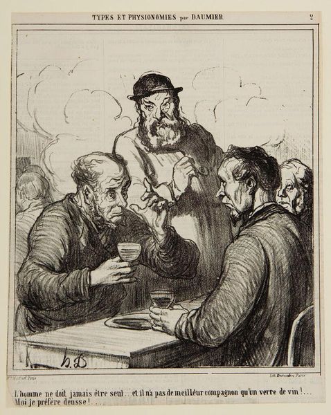 Curator: Honoré Daumier, born in 1808, sketched this lithograph titled "A Philosopher: 'Man should never be alone...and he never has better company than a glass of wine!'" Satires like this were a common theme in his work. Editor: Ah, I love it! It feels…claustrophobic. The smoky atmosphere, the tight framing. Everyone looks so serious, as if pondering existence itself over a tiny glass of wine! Curator: Exactly. Daumier often used caricature to critique the bourgeoisie. This image could be seen as a commentary on the vapid intellectualism of the time, substituting genuine connection with alcohol-fueled debate. Editor: It's kind of sad, though. That yearning for connection is so palpable, even if it's misguided. Makes you wonder what those conversations were *really* about. Curator: Indeed. This piece reminds us of the societal pressures and shifting values of 19th-century France. Editor: Ultimately, it is about the human condition in a bar.