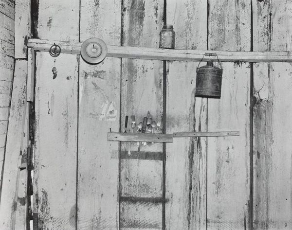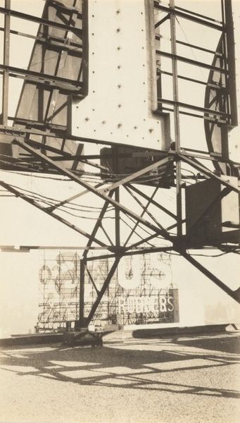 Curator: It strikes me as almost melancholic, this photograph. Bleak but ordered. Editor: Well, let's orient our listeners. The work before us is a photograph, Untitled, by Ralston Crawford, created around 1942. It typifies Crawford's Precisionist style. I am intrigued by how it showcases the grid created by these dark, barred forms – ladder and vent alike – set against a massive wall. Curator: Exactly! It is interesting because grids appear in dreams when a patient feels confined in a situation that has little chance for growth or advancement. In a cultural context, such harsh geometry reflects the cold, impersonal architecture increasingly dominating urban spaces at that time. The high contrast certainly adds to the sense of severity. Editor: And the wall itself – it is such a textural and imposing material presence! You can almost feel the rough surface of the concrete, notice its imperfections. Crawford used a photographic technique that flattens the depth of field, enhancing the stark geometry but it gives a really palpable sense of the physical density of industrial materials. There is a certain lack of grace in such concrete textures, one is made conscious of the cost of material, production and perhaps construction overall. Curator: True. And those drips beneath the vent suggest age, decay. Maybe those drips, set against the sharp lines, represents a form of symbolic cleansing that the architecture and population might both yearn for. This idea that rigid social and architectural forms demand cleansing or refreshing speaks strongly of Modernism's own troubled psychology. Editor: I think so! The composition also directs our attention to labor, a visual ladder allowing access, creating space in a modern city. Yet, where is that labor going? It hints at something – maintenance? Inspection? Access? - beyond the frame, while foregrounding an object made to enable the exploitation of urban and industrial production. Curator: What remains so potent, for me, is its stillness. It is devoid of human figures, rendering its subject, perhaps unconsciously, in need of healing from industrial alienation. Editor: Indeed, Ralston's lens frames a segment of reality, underscoring the processes and weight of industrial production with sharp, critical realism. Curator: A critical realism indeed, perhaps filtered through Crawford’s desire for beauty in what appears mundane, lending a deeply suggestive atmosphere that carries multiple layers of cultural symbolism.