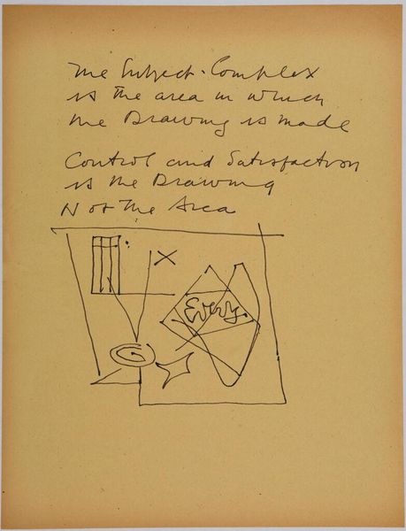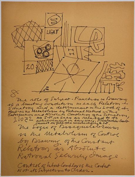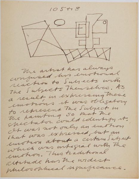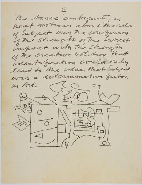 Curator: This is a sketch by Stuart Davis, titled "Art Theory Text with Sketch". It's undated but feels like a manifesto in visual form. What strikes you about it? Editor: The combination of geometric shapes and handwritten text is intriguing. It almost feels like a deconstruction of language and form. What do you see in it? Curator: Exactly! Davis is challenging the established art world, critiquing the commodification of art, and advocating for a more socially conscious approach. The text hints at a system where all relations are disequlibriums, independent of Subject-Complex and its Mass. He's suggesting that the social function of drawing has objective value. Editor: So, the sketch isn't just an abstract composition; it's a political statement? Curator: Precisely. It's a visual declaration of Davis's artistic and political beliefs, rejecting traditional notions of beauty and embracing art as a tool for social change. Editor: I never would have guessed! It's incredible how much context can change your understanding of a work.