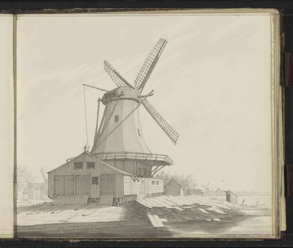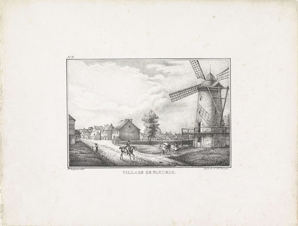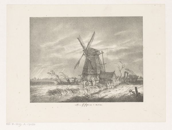 This is "Landscape with a Windmill by the Water" by Théodore Fourmois, a work rendered with graphite and etching. The eye is immediately drawn to the imposing windmill that dominates the scene, its structure a study in contrasts between the solid base and the dynamic, almost frenetic, motion suggested by the sails. Fourmois’s composition hinges on a tension between the static and the active. The landscape itself, rendered in meticulous detail, is still and serene, yet the implied movement of the windmill introduces a sense of temporality. This interplay invites us to consider how technology and nature intersect. Note how the etching technique allows for intricate textures, from the rough stonework of the mill to the wispy clouds above. These elements work semiotically, each detail a signifier within a broader commentary on rural life and industrial encroachment. The landscape, therefore, is not just a backdrop but an active participant in a dialogue about progress. Consider the formal qualities—the balance of light and shadow, the textures, and the implied movement—as Fourmois's way of questioning the relationship between the pastoral and the mechanical, inviting endless interpretations of a changing world.