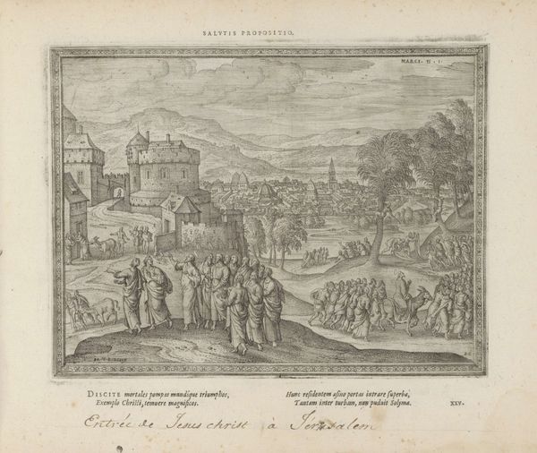 Pieter van der Borcht created "Christus voorspelt de verwoesting van Jeruzalem," or "Christ predicts the destruction of Jerusalem," with pen and ink in the late 16th century. The composition divides into foreground, middle ground, and background, each densely populated. Look at the intricate linear patterns, that form the architecture and masses of people. This dense etching speaks to structuralist thought, where meaning arises from the relationships between these elements. Notice how the linear perspective flattens, compressing the space and reducing depth. The lines create not just forms but also a sense of movement and impending chaos, reflecting the prophecy of destruction. Van der Borcht uses this structure to engage with themes of divine will, human action, and historical consequence. The formal arrangement isn't just aesthetic; it invites us to decode the historical and religious narratives embedded within. This piece remains open for ongoing interpretation, inviting continuous exploration of its artistic and historical resonance.