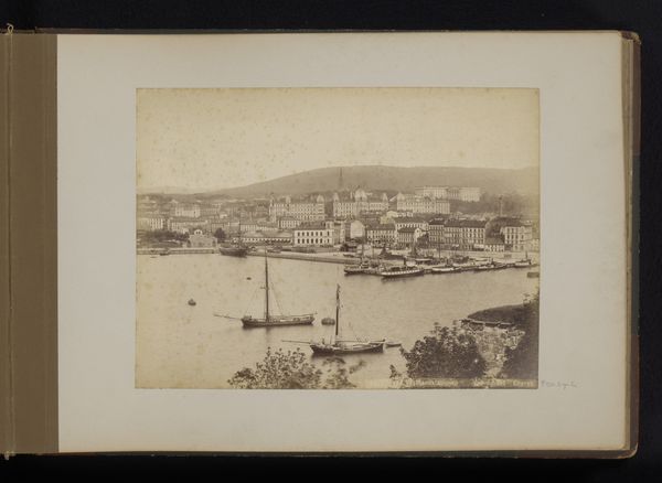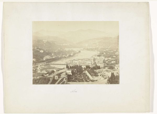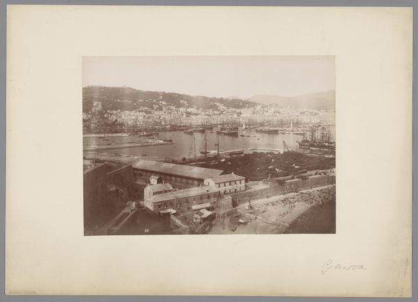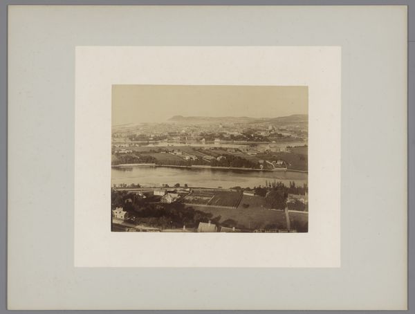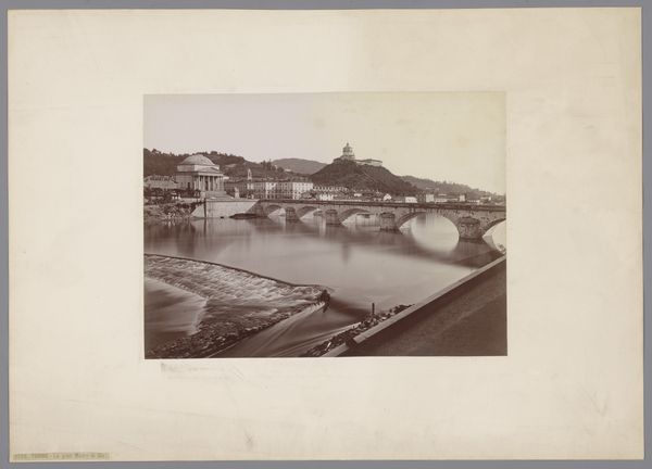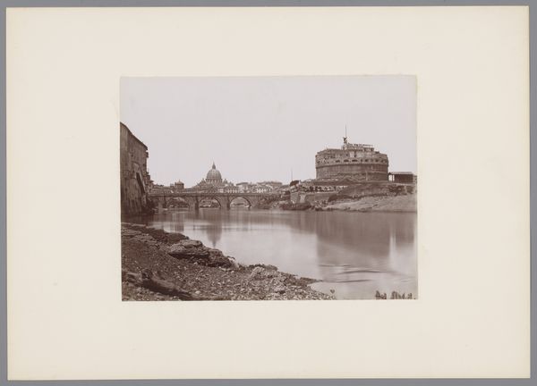 Editor: This gelatin-silver print from between 1864 and 1881 by Giacomo Brogi depicts the Ponte Vecchio in Florence, Italy. The tonal range is subtle and nuanced, creating a subdued, almost melancholic atmosphere. What do you notice about the visual structure and the materiality? Curator: The composition is rather intriguing, isn't it? Note how the photographer frames the bridge not straight-on, but from a slightly elevated and oblique viewpoint, complicating the spatial relationships within the picture plane. The interplay of light and shadow across the water's surface, and on the buildings themselves creates a textured and somewhat ambiguous visual field. Editor: It does seem like the details in the city beyond the bridge sort of fade into the background. It’s really about that central form. What's your take on that choice? Curator: It suggests a focused engagement with the immediate architectural presence of the bridge itself, arguably elevating its structural components into the primary subject of study. In formalist terms, the relationship between line, tone, and texture works to define the pictorial space. Observe how the water acts as a mirror, creating inverted shapes. This contributes to a sense of visual depth but simultaneously flattens the picture, foregrounding its inherent two-dimensionality. The photographer seems more interested in shape than narrative, wouldn't you agree? Editor: Yes, I see that now. It almost abstracts the subject, focusing more on the interplay of shapes than the story behind the location. That’s interesting. Thanks! Curator: Indeed. Looking closely at these formal properties really reveals the unique power this image holds, irrespective of its historical context.