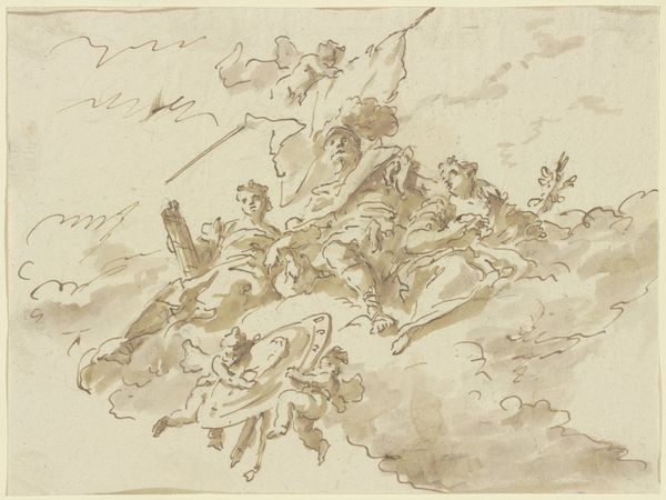 Gaspare Diziani rendered this delicate drawing of Apollo and the Muses, sometime before his death in 1767. Apollo, the radiant god of light and reason, stands amidst the Muses, who embody the arts and sciences. Note Apollo's lyre, an ancient symbol of harmony and order, recalling the Apollonian spirit of classical antiquity. In contrast, consider the figure of Pegasus, the winged horse, often seen alongside Apollo. Pegasus symbolizes inspiration and the soaring imagination, a force that transcends rational thought. We see this motif across time from ancient Greek pottery to Renaissance paintings, each instance echoing a primal human desire to transcend earthly constraints. The interplay of these figures and symbols speaks to the complex relationship between reason and intuition, order and chaos. This tension, deeply rooted in the human psyche, continues to resurface in art and culture, prompting endless reinterpretation and renewed emotional engagement.