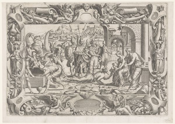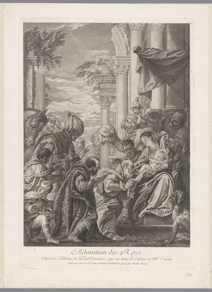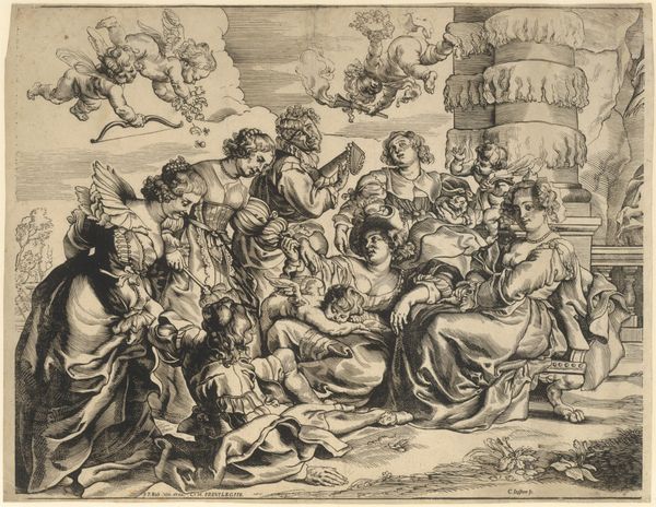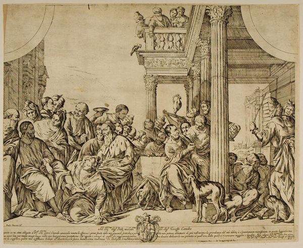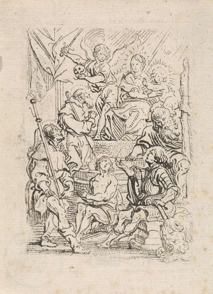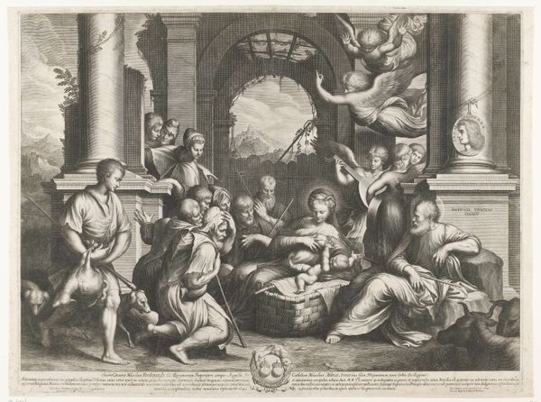 Pietro del Po created this etching, "Adoration of the Shepherds," using metal plates and acid to transfer his design onto paper. The linear quality of the etching emphasizes form and light, with the careful cross-hatching building areas of shadow. Consider how the process demands careful planning and skilled execution, with each line meticulously placed to create the overall image. The material qualities of the metal plate and the biting action of the acid influence the final appearance, dictating the precision and texture achievable in the print. The printmaking medium itself speaks to broader social contexts of the time. This reproductive medium allowed for wider distribution of images, democratizing art and knowledge in ways previously unimaginable, which also speaks to the rise of mercantile capitalism. By appreciating the labor-intensive processes involved, and understanding its place in a wider system of production and consumption, we gain a deeper understanding of its cultural significance.