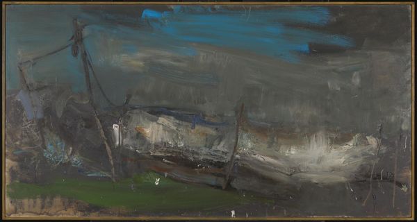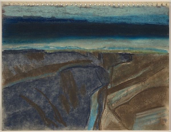 Curator: Edvard Munch's oil painting, "Winter in Nordstrand," from around 1900, currently resides here at the SMK. Editor: A rather somber landscape. Predominantly blues and grays, with only that stark white line of snow cutting across the foreground. It feels…isolating. Curator: Indeed. The muted palette and stark composition definitely evoke a sense of melancholy. Look at the visible brushstrokes, almost frantic in places. It's as if the emotional state is embedded directly into the materiality of the painting. Editor: The structure is fascinating. Those stark vertical tree trunks act almost as a frame within a frame, directing your eye towards the bleak horizon. Did Munch perhaps intend to invoke certain ideas regarding framing, a semiotic technique where certain ideologies are prioritized while others are discarded, potentially exploring psychological concepts? Curator: Possibly. But considering the historical context, one can also see these rather coarse materials speaking about Munch's time in the seaside village of Åsgårdstrand, in Nordstrand. I imagine this sort of scene was common during the winter, thus making it ordinary in a way—the artwork’s real impact may be rooted in how Munch found beauty within this ordinary life. The fact he dedicated several works during that period of his life might reveal a larger narrative of how artistic perception impacts the value attributed to labor or certain modes of making. Editor: I see your point, however I perceive a more universal feeling evoked here. Look at the starkness of the winter landscape, amplified through formal and symbolic compositional arrangements; one finds their emotions reflecting into the artwork to create meaning, rather than relying solely on labor relations. Curator: Art indeed transcends simple material realities. Even something like "Winter in Nordstrand" encapsulates so many social dynamics. Editor: And within these emotional articulations we gain new perspectives into our lived experiences.