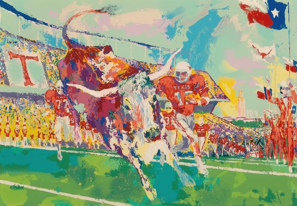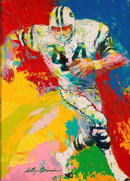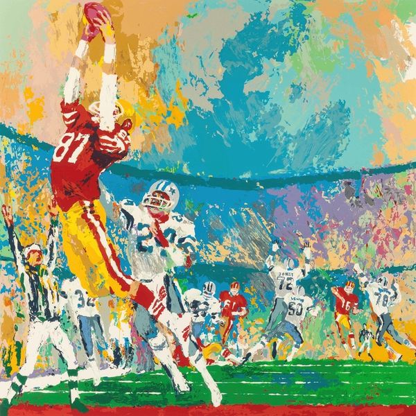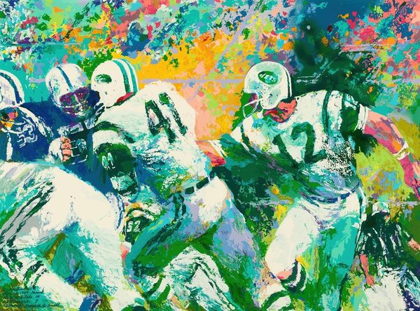 LeRoy Neiman made this image, Touchdown, probably a print of some kind, I’m guessing, from the look of the flat colour. It’s a jumble of bodies and colours, a chaotic scene depicting American football. I really love the yellow in this print, and the way the other colours are all layered on top. The dark blue and purple colours are very satisfying. I’m also a fan of the mark making: it looks like Neiman used quick, loose brushstrokes to create a sense of movement and energy. There’s something very appealing about the way Neiman captures the physicality and intensity of the game. The players are all tangled up, limbs flying, and you can almost feel the impact of their bodies colliding. It is reminiscent of Peter Max, in the way it captures a cultural obsession. Both artists create a really frenetic energy in their work, that leaves the viewer a little breathless! But that’s the beauty of art, right? It’s not about perfection, it’s about capturing a moment, a feeling, a mood.