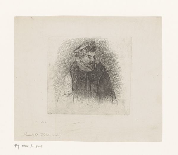 Editor: We are looking at Ferdinand Pauwels's "Man in zeventiende-eeuwse kleding," made between 1840 and 1888. It’s an etching, so a print, and the detail achieved is just remarkable. I’m struck by how meticulously the clothing is rendered, but I wonder about the choice to depict a subject from so long ago. What do you make of it? Curator: It's crucial to remember that artists aren't isolated; they exist within a network of patronage, exhibition spaces, and, crucially, historical narratives. The choice to represent a 17th-century figure during the 19th century signals a deep engagement with the past. Was this nostalgia, a reflection of contemporary society, or something else? Consider, how does looking back serve a purpose in their present moment? Editor: That’s interesting, the "why now" idea of the art. I hadn't thought of that. So, what purpose could this backward glance have served in Pauwels's time? Curator: The 19th century was obsessed with nation-building and constructing historical identities. By representing a man in 17th-century attire, Pauwels is likely participating in the construction of a specific Dutch or Flemish identity, possibly linking contemporary values with a romanticized past. Who was benefiting from this narrative? Was it meant to legitimize power structures, promote a sense of cultural superiority, or even critique the present? Editor: So, this wasn't just about aesthetics but about actively shaping a national story through art. It makes me wonder what stories contemporary art tells about us now. Curator: Exactly. The politics of imagery are always at play, shaping collective memory and influencing societal values. Reflect on how museums play a role, even today, in constructing the grand narrative of art history. Editor: This has given me a lot to think about, particularly how the historical context can shape our understanding of even seemingly straightforward portraits. Thanks! Curator: It’s all about unpicking the layers of meaning that artworks accumulate across time and in relation to specific sociopolitical contexts.