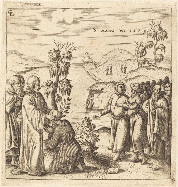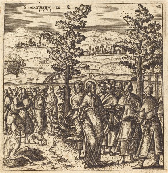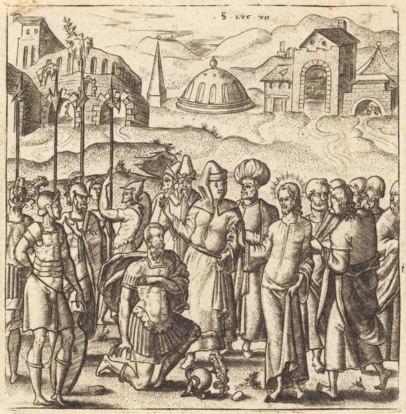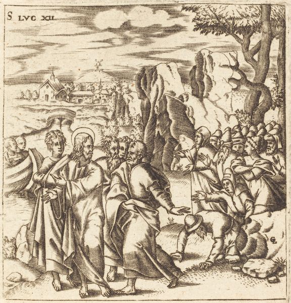 Léonard Gaultier created "The Mission of the Seventy," using engraving techniques that were typical of the late 16th and early 17th centuries. The composition is structured by meticulously etched lines that define form and space in a detailed narrative scene. Notice how the scene unfolds across a receding landscape, from the foreground figures to the distant city. Gaultier uses line and perspective to create depth, drawing the viewer's eye through the composition. The detailed rendering of the figures, with their draped clothing and expressive gestures, contrasts with the more schematic representation of the landscape. This contrast is typical of the period, where clarity of the message was prioritised. The engraving, as a medium, lends itself to replication and dissemination of ideas. Consider how this work fits within the broader context of religious art and the transmission of doctrine in the early modern period. It is an artefact of cultural and spiritual communication, inviting us to consider its role in shaping historical perception.