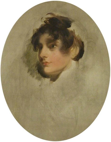 Editor: This is Thomas Lawrence’s "Study of a Girl," made around 1800 with oil paint. I’m struck by the rosy, almost wistful mood it evokes, like a glimpse into a private moment. What do you see in this piece, beyond the surface of a portrait? Curator: The lasting power of an image often lies in its ability to stir collective memory, wouldn’t you agree? Look at the girl’s downward gaze. What emotions does that posture usually symbolize for us? Editor: Maybe…melancholy? Innocence? It feels like she’s contemplating something just out of our view. Curator: Precisely. And consider the unfinished quality, those sketchy edges. Does that impact how you perceive her? It's interesting to note the lack of adornment as well, or a distinct personalizing feature that allows it to stay open for wider symbolic readings. Editor: It does. It makes her feel… vulnerable, or more real, like she's not trying to project a certain image. The open-ended style contributes to the potential interpretations we can find in it. I’m surprised by how moving such a simple sketch can be! Curator: Remember, a portrait, even seemingly simple, is rarely just about the individual. Lawrence captures an idealized, perhaps romanticized, version of youth and beauty. And those symbols continue to speak to viewers across generations. Ultimately, though, do you think the symbolism here is imposed, intended, or more intuitively suggested? Editor: Good point... I'm guessing it is an unintentional outcome of that romantic approach! Curator: Then Lawrence perhaps unknowingly found universality and cultural connectivity through this approach to portraiture.