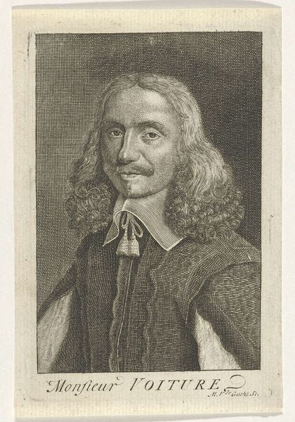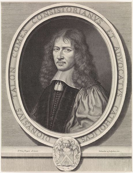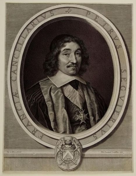 This is a portrait of Henry Godet des Bordes, auditeur des comptes, made with etching and engraving by Pieter van Schuppen. The portrait presents a play of geometric forms against the organic shape of the subject. An oval frame encloses Henry, who is depicted with careful, precise lines that capture his likeness. The subtle gradations of tone and texture, achieved through hatching, give depth to his face and clothing. This formal rendering is set against the soft, flowing lines of his hair. Below, a heraldic shield offers another layer of semiotic information, hinting at status and lineage. The inscription that circles the portrait acts as a linguistic frame, anchoring the image to its subject and suggesting a closed system of meaning. Consider how the artist uses the contrast between geometric shapes and naturalistic representation to construct an image, where every element—line, shape, and text—functions as a sign in a carefully structured composition.