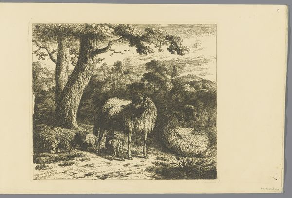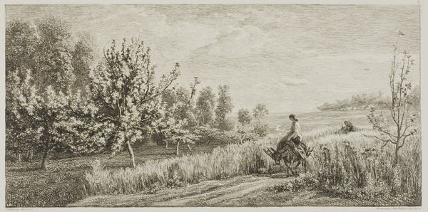 Editor: So, this etching, "Høstlandskab" – Autumn Landscape – made sometime between 1870 and 1881, caught my eye at the SMK. It has a timeless quality... the composition feels balanced and serene. What do you see in this piece, from your perspective? Curator: The landscape speaks to cycles, doesn't it? The harvest is a potent symbol of completion, of reaping what was sown. Notice the way the haystacks are rendered – almost like pyramids or ziggurats, echoes of ancient civilizations storing grain against leaner times. What do they evoke for you? Editor: That's a great observation! I hadn’t considered those historical echoes. To me, they initially felt like a comfortable part of a rural scene, reinforcing a sense of groundedness. The people are small, almost lost in the landscape... Curator: Precisely! That echoes a very old trope doesn’t it? Humanity within, yet diminished by, the scale of nature’s power. This tension plays out throughout art history - humanity's dance with the natural world. Consider the use of line: dense and tangled in the hay, light and airy in the sky. Editor: It almost feels as though the land dictates the activity, if that makes sense. Are there specific traditions this invokes, like folk tales? Curator: Yes, you are absolutely right! Harvesting, feasting, burial and honoring the dead, the painting is a celebration of the cyclical return in line with folk celebrations, echoing traditions celebrating the harvest that were present even then. What would you call these, metaphorically, in art traditions? Editor: A constant thread—cultural memory and continuity in practice. Thinking of that thread… this artwork seems to quietly whisper that, as do so many great works, a powerful observation to end on. Curator: I couldn’t agree more; the layers of symbolism speak volumes if you know how to listen, like whispers across generations.