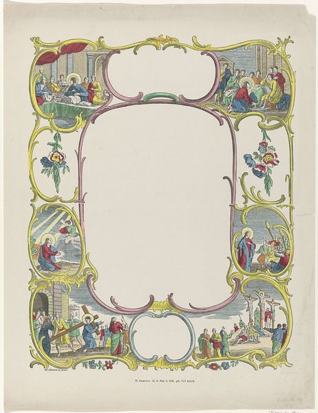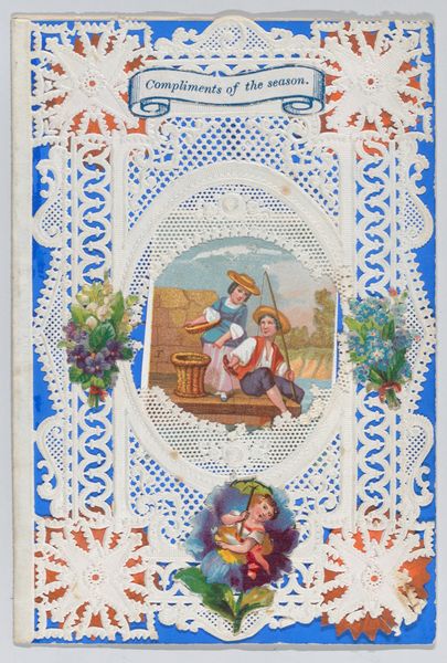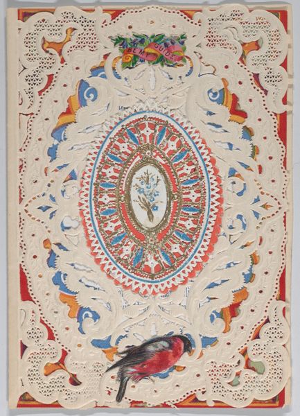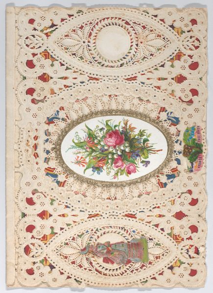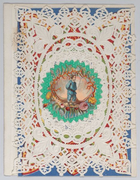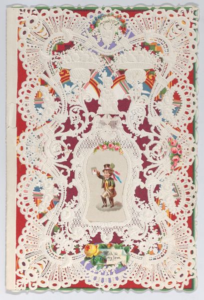 Curator: Let’s turn our attention to a piece from 1879, titled "Valentine," currently residing here at the Met. It's created from drawing, print and paper with watercolours. Editor: Well, it's a captivating object, isn't it? The intricate lace work, framing that idyllic central image… it feels intensely ornate, almost excessively so. Curator: Indeed. But let’s think about Valentine’s Day cards within the socio-economic context of the late 19th century. These intricate, often handmade, cards served as vital forms of communication. A physical, tangible expression of sentiments, and especially affection between classes. The level of detail became a symbol for how far one was willing to go to express the degree of affection and intention for relationship and social status. Editor: I'm interested in how the anonymous artist composes this miniature scene. Notice the central image – a boy and girl, in what appears to be an approximation of Eden, with lush greenery and balanced light – how it acts as a symbolic focus, inviting the viewer's gaze deeper. What do you make of the chromatic relationship of these two characters? The warm reds and cool blues – are these contrasts meant to symbolize opposing forces coming together? Curator: Undoubtedly, and one should not divorce such idyllic imagery from the economic realities and social conditions that these visual cards often served to obfuscate and bypass through fantasy. Genre painting, especially in miniature format, reinforced ideals of sentimental romance and innocence and yet romantic gestures have class implications depending on their recipients and the gifts attached. A painting within painting. Editor: Interesting, very interesting, and I would push back slightly because there's also a decorative, non-representational quality about this print too – the repeated patterns, for example, that draw the eye up and outwards towards these little decorative angel figures hovering and holding poses in between foliage. Do you feel there is a particular message being created there? Curator: Precisely! One might further read them as the physical manifestation of cupid which is further a complex signifier from across several cultural, sexual, and symbolic levels that go beyond what its aesthetics denote on a basic design appreciation scale. Editor: Food for thought, indeed. "Valentine" is an example that teaches you something new upon each re-examination of its structure. Curator: I find it continually opens up complex questions about social hierarchies through what its material composition actively sought to disguise.