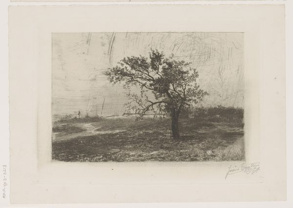 Nelly Bunge created "Boom aan een pad," or "Tree on a Path," using etching, although the date is unknown. It depicts a solitary tree beside a path near a body of water. Looking at the image, the use of etching brings out the intricate details of the tree's bark and branches and the surrounding foliage. Without knowing the exact date or the cultural context in which it was made, it is difficult to be conclusive but it's interesting to speculate on the socio-political context and how it may have influenced the artwork. Does the image create meaning through visual codes, cultural references and historical associations? As art historians, understanding the institutional context and the artistic and intellectual currents of Bunge's time will enrich our appreciation and interpretation. By looking at exhibition records, archives, and published sources, we can begin to understand the possible nuances in the image. It would be fascinating to uncover the conversations and debates about art, nature, and society that shaped this artwork.
