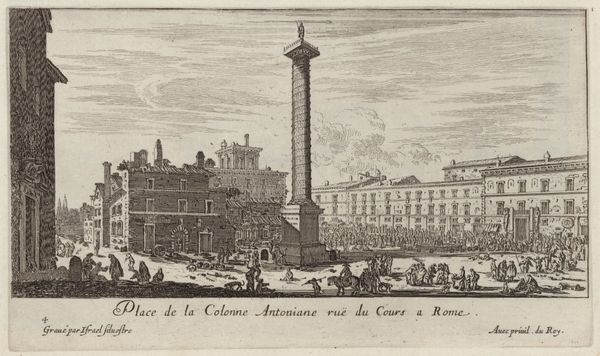 Curator: Let’s discuss "Fontein op Piazza della Madonna dei Monti te Rome," a print created by Giovanni Battista Falda between 1653 and 1691. It’s currently held in the Rijksmuseum. What strikes you initially? Editor: It has this tranquil stillness about it. A captured moment, yet buzzing with quiet human activity against this impressively rigid architecture, softened only slightly by that ornate, central fountain. Does that make sense? The etching renders it almost ghostly, like peering into the past. Curator: Yes, and it's important to observe the way Falda uses line to articulate space and form. Notice how the dense, precise engraving defines the fountain’s baroque details and the buildings’ structures, while lighter touches suggest the atmospheric perspective, the airy distance. Editor: Definitely! The depth of field tricks the eye into feeling like we’re *actually* there. Those small figures scattered around–they almost look like they’re waiting for us! It's the epitome of baroque Italian city life, idealized yet realistic in its representation of social life. Curator: Exactly! And, if we think about semiotics here, the fountain functions as a signifier of Rome's civic pride and architectural prowess. The very rigid geometric pattern throughout creates harmony in what seems like simple architectural setting. This image encapsulates Baroque ideals by combining structure and depth, as well as the artist's technique of the light to emphasize that sentiment. Editor: I think also about how these kinds of prints helped disseminate architectural ideas. Imagine the impact this image would have had then—virtually transporting someone to Rome! Not everyone had access to travel as we do today. These are little time capsules with very impactful design! Curator: Precisely. Studying its formal composition helps unlock not only the historical and aesthetic significance of this print but how meaning has layered up across decades of human interaction. Editor: Thinking about this piece, I’m more inspired by the stories held within the captured moment –a dialogue that connects past and present as much as geometry and symmetry connect this artwork together.