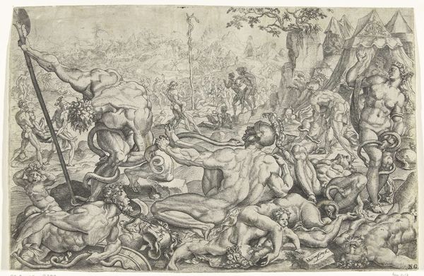Editor: So, this engraving is called "The Climbers," created around 1524 by Agostino Veneziano. What strikes me first is the energy, but there’s also a vulnerability in these figures. How do you interpret this work? Curator: It’s interesting you mention vulnerability. We often overlook how the Italian Renaissance wasn’t just about idealized beauty. Consider the political landscape of the time: constant warfare, shifting power dynamics. Could these "climbers" represent the precariousness of social mobility, a struggle for survival amidst turmoil? Editor: That's a compelling point. I'd assumed it was about heroic ascension, maybe inspired by classical myths. Curator: Perhaps, but through a critical lens, what if their "climb" isn’t aspirational but desperate? Note the tension in their bodies, the potential violence, figures helping or fighting each other and those seemingly indifferent riders overlooking everything on horseback in the back. What narratives are excluded from the heroic, idealized stories we tell? Editor: It really makes you wonder about those who didn’t make it, the people crushed in the power struggles, or, quite literally, who could not physically make it up that mountain side. Thank you for the shift in perspective! Curator: Absolutely. Art can provide social commentary if we choose to view it from new vantage points. Now you made me think… Perhaps they were literally climbing away from war towards salvation! Food for thought.