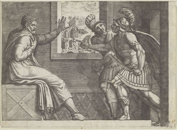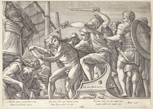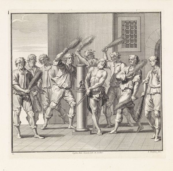 Curator: This is "The Flagellation of Christ", an engraving produced sometime between 1625 and 1670, attributed to Mattheus Borrekens. It's currently held here at the Rijksmuseum. Editor: It’s immediately striking in its brutal detail, the almost theatrical staging. Look at the sharp lines, the intense contrasts – it really emphasizes the violence of the scene. You can almost feel the sting. Curator: Exactly. Consider the context. Printmaking in the 17th century was crucial for disseminating religious imagery to a wide audience. Prints like these would have been affordable, allowing even poorer members of society to contemplate such iconic moments. Editor: And what a tool it must have been. An inexpensive way to promote doctrine through mass production. It highlights how easily narratives were reproduced through material culture. What I notice are the disparate qualities and textures, look at the executioners' crude weaponry – whips, switches, juxtaposed against Christ’s vulnerable, exposed flesh. Curator: The theatricality also owes a debt to the Baroque style. Dramatic composition, heightened emotion. Look at how Borrekens stages the scene, with the figures arranged almost as if they are on a stage, columns giving scale and classical gravitas while creating spatial divisions. Editor: Notice how the engraver manages to give mass and volume through this very involved layering technique, giving density to these tormentors in comparison to the relative bareness of Jesus. What are we supposed to glean about social stratifications through that intentional dichotomy of making? Curator: One interpretation is of Christ as the figure of hope for a socially disparate audience. Consider too the politics inherent to image making at the time. Remember, in the Dutch Republic religious representation was a loaded subject after the Reformation. Images served social functions of all sorts beyond simply representing a Biblical passage. Editor: And by turning this sacred act of religious iconography into a tangible, material product like a print, the narrative becomes, at once, a token of devotion and also an element deeply rooted in commercial exchange, which certainly changes the original intention. Curator: A fascinating and very insightful way to put it, it reminds us of the complex tapestry of forces at play during its making and subsequent distribution and consumption. Editor: A visceral rendering; one really feels both the weight of materials and their capacity to tell familiar stories anew.