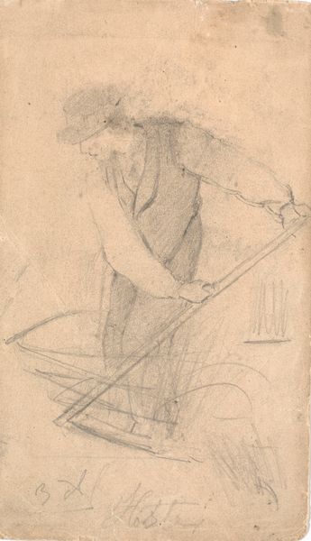 Curator: Van Gogh's "Reaper," a charcoal drawing completed in 1885, showcases a figure bending deeply, poised with a tool. A somber air settles as we contemplate the monochromatic medium. Editor: Yes, the first impression is undoubtedly one of heavy labor, isn’t it? The hunched posture and the weight of the implement… It all conveys a palpable sense of burden and speaks to the broader issues of social realism prevalent during that era. Curator: Absolutely. Consider how the artist has used contour lines. The weight, it seems, is not solely literal but structural, built in with each calculated stroke. This figure dominates the frame, a solid shape forged of lines and form. Editor: It is impossible to divorce this from its time. Van Gogh was clearly interested in conveying the harsh realities of rural life and working-class struggles through imagery of peasant existence. Notice how he captures not just the physicality of labor, but also its emotional weight. Curator: Note the subtle shift in pressure with each charcoal line, generating the very illusion of a worker weighed down, bowed against an unseen but implicit hardship, isn’t it? And the barest implication of landscape serves only to place our lone worker. Editor: Precisely! Van Gogh's focus was on everyday working figures and revealing their personal stories during times of significant social stratification. These images were rarely devoid of a pointed, implicit statement. What kind of world lets the working person get so worn out? Curator: Thus, the power resides within the inherent visual dynamic and the very visible process of rendering. We sense the very essence of laborious motion rendered with exceptional technical skill in black and white. The artist creates an essential study of form while alluding to narratives beyond itself. Editor: He draws attention to the silent narratives etched into working class lives, asking the viewer to confront their significance beyond the artistic form itself. He asks us to reconsider the values inherent in society and to challenge our complicity through imagery that demands attention. Curator: Looking carefully, then, reveals the potent relationship between structural artistry and implicit expression and Van Gogh’s keen understanding of line, shade, and composition to represent emotional, economic, and societal burden. Editor: Precisely, it pushes us to question and see what’s truly beneath the surface. And within this charcoal work from Van Gogh, we find that complexity layered upon somber observation, revealing uncomfortable truths.