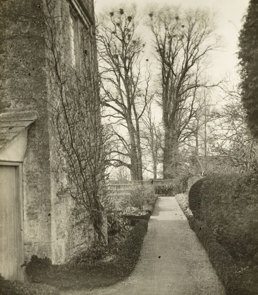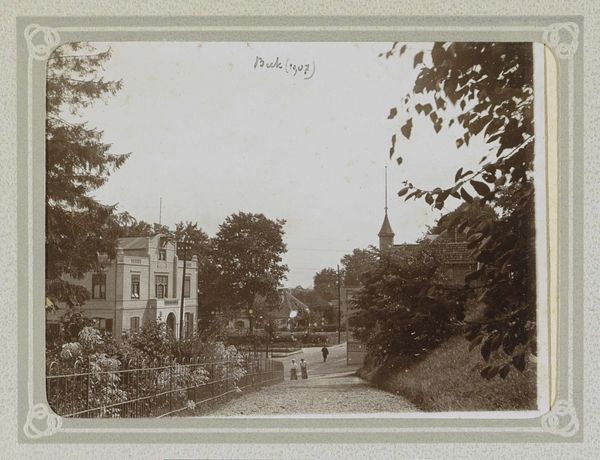Curator: This is a photograph by Folkert Idzes de Jong, titled "Laan met een gezicht op Hotel Laag Soeren," likely taken between 1905 and 1907. Editor: It evokes such a sense of faded elegance. The monochromatic palette makes it appear almost like a memory surfacing from the past, leading towards this stately building obscured by the towering trees. What kind of photographic materials do you think he used to capture this scene? Curator: Given the period, it would almost certainly be a gelatin silver print. These prints offer a sharpness and tonal range quite striking here; that detail really enhances how those massive trees frame the perspective, don't you think? The long road draws your eye right to the hotel. A deliberate use of leading lines if ever I saw one! It guides your eye toward that cultural monument, or social gathering spot of the moment, rendered almost dreamlike. Editor: Exactly. The framing isn't accidental. It's fascinating how De Jong uses what's readily available – the trees, the lane – to dictate not just composition but also narrative. Was Hotel Laag Soeren a cultural or political meeting place? I imagine that access to photographic materials influenced who got to decide whose story to memorialize in a photo. The sepia tone enhances that, I would add. Curator: Yes, very much a place for the wealthy and influential of the time, giving the photograph an indexical nature linked with its social status. What seems simple, almost documentary, hints at layers of meaning regarding Dutch society at the turn of the century. It also connects to our persistent need to inscribe value, even prestige, onto specific locations, seen through the lens of nostalgia. Editor: This discussion is reminding me how even realistic images rely on manipulation—in lighting, process, and the social framework in which photographs emerge, impacting the viewer's response. Curator: Precisely; an image always relies upon our understanding, whether implicit or explicit, to transmit intended, and unintended meaning, something photographs taken at the time were acutely aware of, or maybe less so. Editor: Thinking about the value it conveys in documenting the intersection of wealth, landscape, and representation provides much-needed nuance when contemplating historical shifts in both cultural and political perspectives in landscape painting.