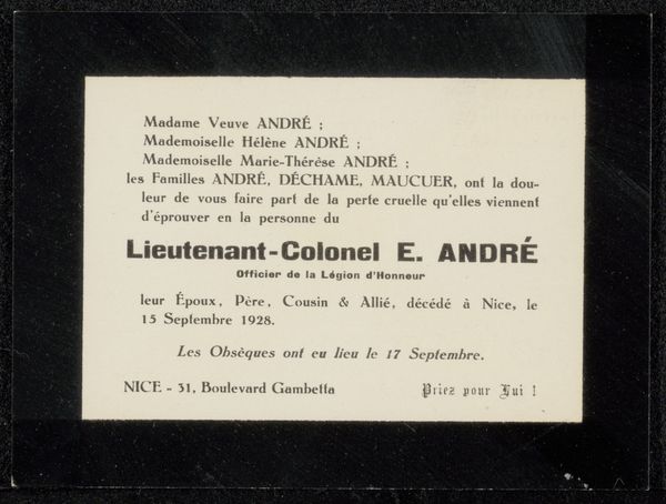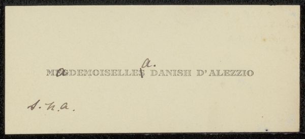Editor: This is a print from before 1899, residing in the Rijksmuseum: 'Bedankkaart aan Philip Zilcken.' It seems simple, just some names listed in beautiful typography. Yet, there's also this faded triangle pointing towards the text, creating an ethereal and, well, sort of ghostly vibe. What catches your eye when you look at this? Curator: Ah, it whispers of bygone eras, doesn't it? To me, it evokes the intimacy of correspondence and the ritual of acknowledgment. Envision late 19th-century Paris; these names likely belong to individuals within literary circles. Each carefully chosen font implies a social decorum, and I sense a real intentionality behind each printed letter. But look closely at the triangle – is it merely an aesthetic touch? Or perhaps… do you think it subtly indicates the sender's humility, pointing towards those whom they thank? Editor: Humility is an interesting angle! It's like this ethereal quality almost masks what is inherently just a note of thanks. I guess I hadn't considered that it could actually reveal as much as it conceals. Curator: Exactly! Sometimes what we perceive as concealment is, in fact, a spotlight on something deeper. It nudges us towards questioning social dynamics within intellectual circles of the time. It’s not just a card; it's a keyhole glimpse into a world of writers, their interconnectedness and the unspoken rules that governed their exchanges. Now, doesn’t *that* bring it to life in an unexpectedly loud way? Editor: It really does! It seemed like such a simple piece at first glance. Thank you, it gave me a lot to think about. Curator: My pleasure. The true magic, my dear friend, resides in the unfolding layers – like those subtle triangular shapes – we discover with a little curious reflection.