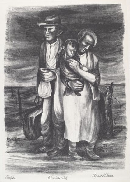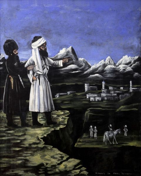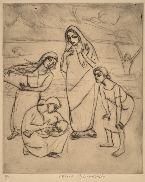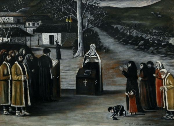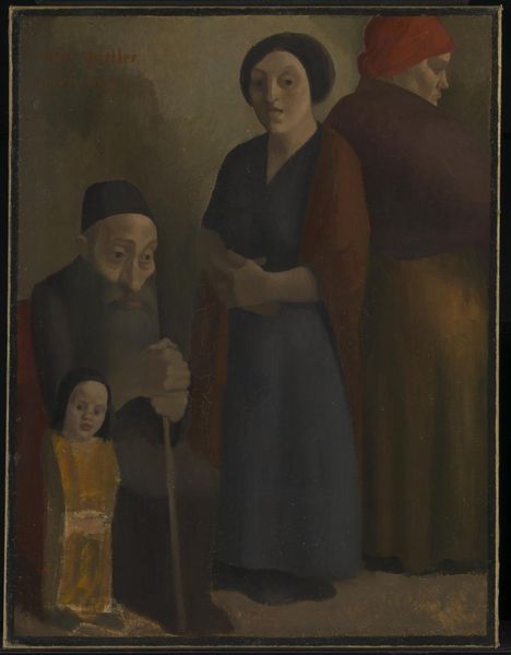 Niko Pirosmani made this painting of a Peasant Woman with Children in Georgia, using oil on oilcloth. The choice of oilcloth as a support is significant. Typically used for practical purposes like tablecloths, here it elevates the everyday material to the realm of fine art. The rough texture of the oilcloth absorbs the oil paint, creating a matte surface that enhances the painting’s raw and honest feel. Pirosmani's direct application of paint, with minimal blending, contributes to the work’s distinctive appearance. The dark background, typical of Pirosmani’s style, makes the figures stand out, emphasizing their solemn expressions and the weight of the water jugs they carry. This emphasis on the material, the making, and the social context, invites us to reconsider the accepted hierarchies of art, and to value the skill and vision found in unexpected places.