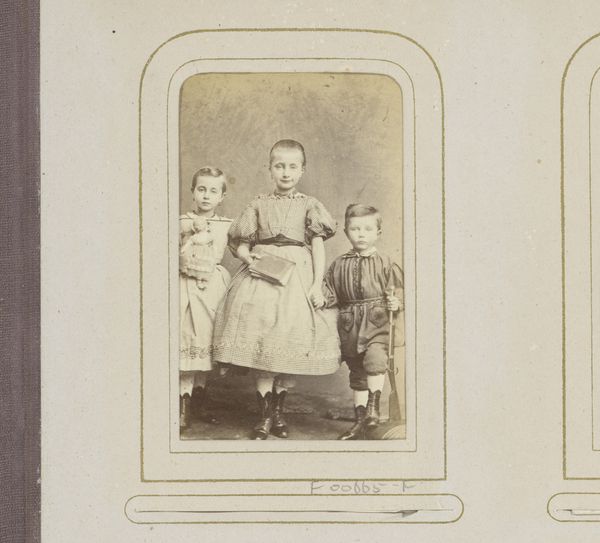 Curator: Here we have Johan Hendrik Hoffmeister’s “Portret van drie meisjes,” or “Portrait of Three Girls,” a gelatin silver print likely made between 1877 and 1883. It’s immediately striking, don't you think? The composition has such stillness to it. Editor: Stillness, and an odd sort of labor showing itself! Look at the way those girls are dressed. It’s fascinating to me how much detail has gone into the ruffles and folds. What were their lives like? Who made the dresses? All that intense detail sewn into heavy dark wool, likely by someone who saw none of the status afforded the wearers... Curator: Yes! It does invite questions. The materiality here feels particularly poignant. It speaks to an almost tangible weight of expectation, perhaps? The photo feels laden with unspoken stories. Their gazes hold so much… solemnity? Maybe that's the wrong word. It is an artfully staged scene, though—a studio photograph, designed to convey respectability. Editor: Designed to look respectable, absolutely! But respectability is *work*. Making and maintaining appearances. Those complicated dresses needed to be constantly repaired and cleaned by someone, and I bet it wasn't those children. It reminds us that images always have hidden labor costs. Also the gelatine, it was extracted through the work and violence enacted on animal bodies... Curator: The violence is always part of the picture, isn't it? Even in portraiture. Yet beyond the undercurrents of class and industry, the image also breathes a delicate innocence. You can feel it in the awkward postures of the girls, how they haven’t quite learned to pose. They seem like they are holding back laughter or conversation, so it makes you wonder who they really were behind the trappings. Editor: Behind those painful, itchy frills and buttoned-up sleeves! Thinking about those garments – the physical demands of creating something so elaborate… it is a testament to hidden histories, of exploited labor as well as the beginnings of accessible photographic methods. These gelatin-silver prints democratized image-making, sort of. Curator: Leaving an imprint nonetheless, across lives and history itself. That’s why even with the studio constraints, even with my initial thoughts of staged performance, there’s something genuine still. And the interplay—between representation, aspiration, and social force, so to speak—lingers long after viewing it. Editor: I agree. These quiet images are worth spending time with; a good antidote to the flood of instantly consumed images of today. There's a power in slowing down, contemplating the sheer effort, visible and invisible, that shaped them and which they continue to show us.