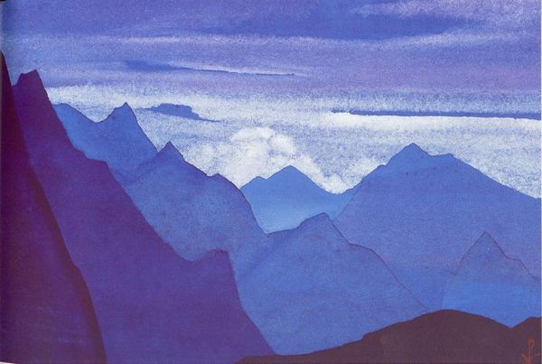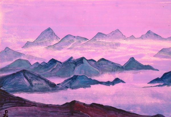 Nicholas Roerich painted this artwork of the Himalayas, his favorite subject, sometime before his death in 1947. Roerich was deeply influenced by the spiritual and philosophical traditions of the East, seeking to capture the sublime beauty and mystical qualities of the mountain range. His paintings reflect a broader cultural fascination with the East, common at the time. However, Roerich went beyond mere aesthetic representation, integrating his spiritual beliefs and a search for enlightenment into his artistic practice. The Himalayas, for Roerich, were not just a landscape but a sacred space. Roerich's use of color evokes a sense of the ethereal, with gradations of purples and pinks creating a dreamlike quality. These colors, combined with the stark white peaks, suggest a space that is both awe-inspiring and serene. The Himalayas series deviates from traditional landscape painting, as Roerich's focus on the spiritual essence of the landscape reshapes our understanding of nature. These paintings offer a space for contemplation, inviting viewers to consider their own connection to the natural world and the deeper mysteries of existence.