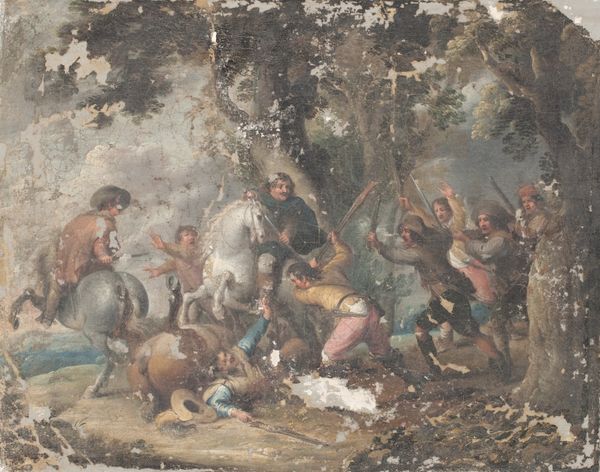 Editor: We’re looking at "The Fight at the Venta Nueva," a gouache and oil painting by Francisco de Goya from 1777. There’s such raw energy here; it’s quite a chaotic scene, almost like a snapshot of everyday conflict. What do you see in this piece, beyond just a bar fight? Curator: Beyond the immediate brawl, I see a reflection of deep social fissures. Goya situates this fight at a "venta," a roadside inn, which served as a gathering point for various social classes. It is vital to investigate who is fighting, and about what? Goya challenges us to consider who holds power and how marginalized groups are pitted against each other. Editor: That’s interesting. I hadn't considered the social commentary aspect. The clothing does seem to suggest different social strata clashing. Curator: Exactly. This wasn't just random violence; it reflects inherent tensions within Spanish society. We might even ask, is this painting commenting on class struggle, or is it reinforcing existing power dynamics by showcasing such scenes? How might contemporary feminist or race theory help us to see deeper patterns of systemic inequality? Editor: So, the artwork is not simply documenting a moment, but really, is also prompting viewers to reflect on issues that might otherwise go unseen, on the societal imbalances baked into the system. Curator: Precisely. Goya uses the everyday to expose uncomfortable truths, asking us to confront not only the violence on display but the structures that enable it. Reflect on how the picturesque Romantic landscape juxtaposes sharply with the brutality taking place on the foreground. Editor: It makes me rethink genre painting as not just scenes from everyday life, but commentary on real-world conditions. Thank you for that! Curator: My pleasure. It’s crucial to view art as more than aesthetics; they can serve as visual testaments to social and political issues.