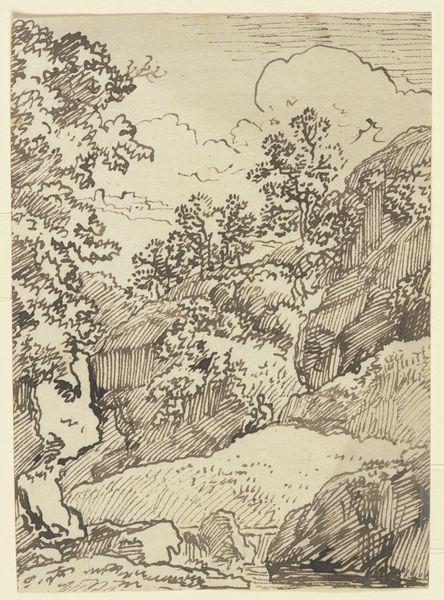Curator: Here we have Karel Vitezslav Masek's watercolor painting "Stary Hrosenov", created in 1889. What strikes you immediately about it? Editor: The scene is peaceful, almost idyllic. The muted palette lends the painting a sense of nostalgia. Curator: Indeed. This work fits into a larger discourse around the commodification of the rural ideal within Czech nationalism during that era. Consider the implications of depicting a 'Stary' – Old – village. What stories is the artist telling us about Czech identity through landscape? Editor: The emphasis on plein-air is vital. Note how Masek captured this scene en-site, reflecting a dedication to ruralism. It speaks to a desire for unmediated access to this specific location's reality. Curator: Yes, but what about the labor implicit within the construction of the thatched roof, for example? This piece begs consideration around the lived realities of those residing within this "idyll". Editor: Absolutely. The thatching utilizes specific, readily available materials – reeds or straw, tightly bound. It illustrates an understanding of craft, sustainability, and how those things translate into community. What social dynamics allowed a painting such as this to surface in a culture obsessed with idealization? Curator: Excellent question. You're inviting us to explore how images like this actively shape national narratives, sometimes overlooking class dynamics inherent in the romanticization of peasant life. The solitary figure, rendered simply, what narratives of belonging – and exclusion – might be circulating around this presence? Editor: Masek’s treatment of the materials - the watercolor bleeding across the paper - amplifies this sense of place. One gets the sense of damp earth and soft light as both sensory data and commentary of working with immediate surroundings. Curator: The dialogue you initiate between environment and material process offers critical possibilities to contextualize Masek's vision. The work then presents itself as an intersection, actively participating in both the creation – and critique – of the cultural landscape in which it operates. Editor: And in considering the labor and the location captured together, we open the scene up for continued examination of these values within today's environmental discussions.