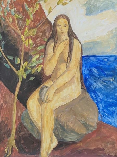 Curator: Kateryna Lysovenko's arresting painting from 2022, done in acrylic and oil, greets us with its intriguing figures. The title, "I Refuse to Live on the World Which Reproduces Collective Graves," gives us quite a bit to ponder before we even look closely, doesn’t it? Editor: Absolutely! My initial impression is one of unease mixed with mythology, or perhaps a corrupted version of it. There’s this almost childlike simplicity to the figures, yet the subject feels heavy, almost apocalyptic. It makes you question the narrative. Curator: Yes, there's definitely a deliberate primitivism in the style, a rawness that amplifies the painting's emotional impact. Those figures... the hybridity is striking. Are they warnings? Lost souls? Each looks oddly detached, and placed somewhat randomly in a desolate landscape. It reminds me, in some ways, of a theatrical stage where no real drama is actually performed. Editor: That detachment is chilling. They seem both present and absent. I’m intrigued by the reddish-brown earth contrasted against the narrow strip of stark blue sky. The earth looks almost like rust. The sky almost feels like an afterthought... is this symbolizing a kind of lost hope? Curator: I interpret that use of the sky similarly. The composition, dominated by earth, hints at confinement, while the blue becomes a distant, unreachable ideal. Considering the title, this could be seen as a conscious commentary on societal structures that perpetuate violence and trauma. Editor: So you're suggesting these mythical creatures embody victims of some sort of systemic ill? Curator: Potentially. They might represent those forced to exist within a flawed world. Lysovenko doesn't offer easy answers, and that is her painting's real strength: the power to initiate a very private search within yourself. She offers visual metaphors; it's up to us to figure out what it is *we're* searching for. Editor: Right. This isn't a painting that hands you meaning on a silver platter. The refusal in the title, I think, serves as both an indictment and an aspiration, prompting viewers to critically examine their own roles within larger socio-political landscapes. And it’s an expressionist act of the first degree. It invites viewers to dwell in that space between desolation and a fragile hope. Curator: I think I concur wholeheartedly, even as I'm left unsettled... in the best possible way! Thank you for that excellent insight! Editor: My pleasure, it was really helpful in crystallizing my impressions, thank you!