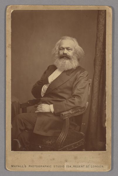 Editor: This is John Collier’s pastel portrait of Karl Marx, created in 1977. The texture created with the pastel medium feels very soft, almost gentle, which contrasts with the typical image of Marx as this revolutionary firebrand. How do you interpret this particular depiction? Curator: Well, consider how artists depict powerful figures over time. There are familiar attributes, such as dress or pose, that come to represent specific cultural ideas linked to the portrayed. Here, the flowing beard becomes a symbol of wisdom and perhaps even patriarchal authority. The artist plays with that. What kind of associations does that trigger in your mind? Editor: It’s interesting. The beard is definitely prominent. It reminds me of images of Old Testament prophets, or even depictions of Zeus. But given Marx’s philosophy, those seem like loaded, almost ironic references. Curator: Precisely. Visual language is all about layers of meaning and subversion. What do you make of his gaze? Where does it seem directed? Editor: He’s looking slightly off to the side, not directly at the viewer, as if contemplating something beyond us, perhaps the future he envisioned? Or maybe it gives the feeling he’s sizing us up. Curator: That averted gaze adds another layer of complexity. It resists the immediate connection a direct gaze would invite, suggesting a certain aloofness or even distrust. A powerful image, layering visual references in unexpected ways, challenging us to consider the many faces of legacy. Editor: It's fascinating how a seemingly straightforward portrait can contain such rich layers of symbolic meaning. Curator: Absolutely, and remembering the cultural memory connected with this philosopher! It speaks volumes about the ongoing power of images to shape and reshape our understanding of history and its key players.