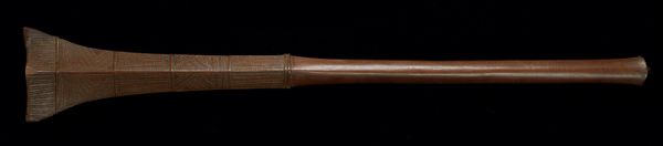 Curator: Here we have a striking wooden sculpture from the Yaka people, simply titled "Pipe," dating to the mid-20th century. What strikes you initially? Editor: The sheer linearity of it! The long, pale wood shaft leads to a darkly carved head. It's almost unnerving how such different aesthetics meet so abruptly. Is it functional as well as artistic? Curator: It's important to remember that the Yaka culture imbues everyday objects with spiritual significance. Smoking, in many indigenous cultures, becomes a ritual act, a conduit to the spirit world. The "Pipe," although functional, transcends its utilitarian purpose. Editor: So, considering the Yaka emphasis on ancestor veneration, could the carved head at the bowl of the pipe depict a significant ancestor? And what's the historical context? Were these pipes exclusive to certain classes, perhaps chiefs or elders? Curator: Precisely! Among the Yaka, certain objects like this would symbolize status. The level of ornamentation, the quality of the carving, all communicated social standing. We need to think about colonization, too. Mid-20th century places it squarely within periods of intense colonial pressure. The pipe might be subtly encoding resistance, reaffirming indigenous identity in the face of foreign domination. Editor: It feels...assertive. Even with its slender form, it makes a statement about presence. But I wonder about the accessibility of this type of artistry given historical and present sociopolitical dynamics in Yaka communities? Has its original meaning changed, particularly with the increase of cultural appropriation in Western societies? Curator: Undoubtedly. Art objects that enter museum collections are subject to reinterpretation. It becomes our responsibility as viewers to unpack those layers, and reflect on issues of power, representation, and respect. Understanding that historical and current context is paramount. Editor: So the object invites a conversation far beyond aesthetics – sparking essential dialogues around cultural preservation and post-colonial narratives. Curator: Precisely. It reminds us art's inherent capacity to connect past injustices with present-day realities.