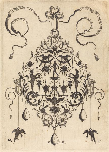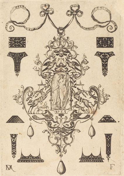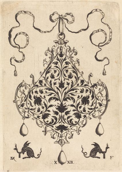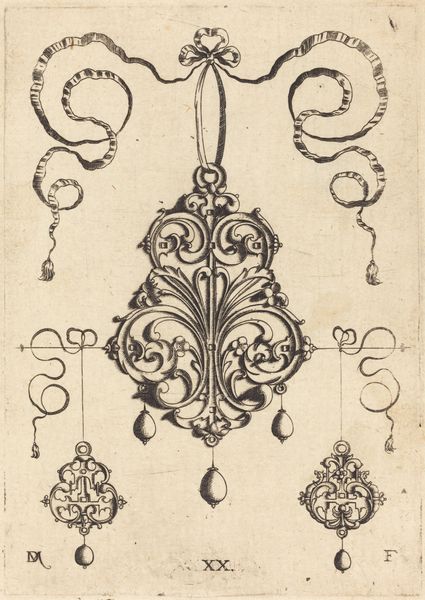 Editor: This is "Large Strapwork Pendant with Two Hangers as Earrings at Left and Right," an engraving by Daniel Mignot. It feels like something out of a fantastical jewelry catalog. All these lines create this elaborate, almost architectural form, but it's for a pendant! What strikes you most about this design? Curator: Ah, strapwork! Imagine intricate leather strips, architectural flourishes rendered delicate, portable, wearable! What Mignot offers is more than just ornamentation; it's aspiration turned ink. Look closely: those hanging pendants? Miniature worlds dangling, reflecting status and perhaps even a hint of personal mythology. I’m seeing Baroque extravagance trying to shake hands with a clean, almost proto-modern sensibility. Almost a meditation of sorts: how much is too much? Editor: A meditation, really? It seems so declarative. I wonder what kind of person would commission such a piece? Curator: Perhaps someone teetering on the edge of societal acceptance, desperate to proclaim their affluence *and* artistry simultaneously. You know, “Look at my breeding, and my *wit*.” And let’s face it, those ribbons at the top…they don’t just suspend the pendant, they practically *announce* it! Have you considered, however, the relative visual restraint within that complexity? Is that tension not intriguing? Editor: I suppose I was too distracted by the bling to consider its balance! Seeing it as this controlled tension is fascinating. I initially saw opulence, but now, this feels more considered. Curator: Precisely! Art always invites-- or rather, demands -- a second glance, doesn't it? It’s a flirtation, you see, an offering of ever more nuanced readings as your experience expands. What a gift, really!