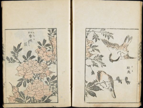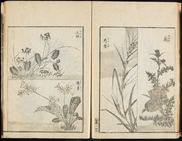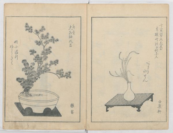 Editor: This artwork, "Pictures by Famous Artists," by Yosa Buson, dates back to 1814. It's rendered in ink, and classified as a drawing. It presents as an open book showcasing distinct scenes, almost like a diptych. On the left, we see detailed flora; and to the right, an open space. What strikes me is the juxtaposition—a sense of intimacy and wildness. How do you interpret this work, seeing it as a formalist? Curator: Formally, it is quite fascinating. Observe the contrasting compositions. The left page is dense, tightly packed with floral elements utilizing darker ink wash. Note the shapes and how they build upon one another to produce a satisfying formal symmetry that fills up much of the upper-left quadrant of the frame. How would you describe the arrangement of space on the right page by comparison? Editor: The right page feels markedly different, more open. The drawing exhibits less density, depicting trees rendered with fluid strokes. Their looping boughs frame open sky and water. It seems less about filling space, more about delineating shapes to allow negative space to play a critical role in completing each gesture. The movement in the branches is striking! Curator: Precisely. The structural contrast between the dense, grounded flora and the sparser, airy landscape establishes a dialogue of form. Consider the function of the heavy lines defining each page’s borders in relation to the lighter linework within them. Does it establish the picture plane or provide structural boundaries for the interior forms to disrupt? What affect is produced as a result of these material arrangements? Editor: It adds to the composition to create emphasis in a visual push-and-pull dynamic. The linework makes the shapes advance, the borders cause the compositions to recede slightly, enhancing the dimensional aspect, don’t you think? I can see it almost jumping off the page at me. I hadn't considered how much the composition played off of itself. Thanks for pointing this out. Curator: Indeed. The power of formal analysis reveals the artist’s thoughtful manipulation of space and form. Through subtle details, Buson evokes visual intrigue within the work’s self-contained structure, no external context needed.