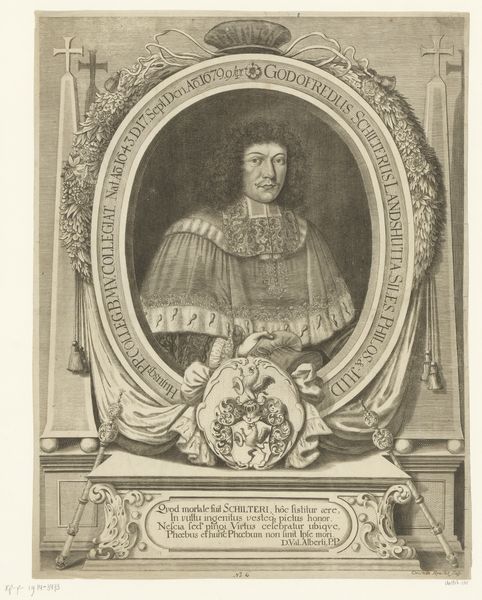 This is Matthäus Merian the Younger’s etched portrait of Georg Paukul. It was crafted during a period of immense social hierarchy and conflict. Paukul’s identity as a military figure is clear. The portrait exudes power; his armor, the text around the frame, and his family crest speak to his status. Yet, the image is also deeply human. Paukul’s gaze meets ours, hinting at a complex individual behind the symbols of authority. It’s interesting to consider how portraits like this were used to reinforce societal structures, but also to immortalize individuals. The act of creating and displaying such a portrait was a political act, reinforcing power dynamics of the 17th century. However, it also offered a space to negotiate identity and legacy, both for the sitter and the artist. This image captures a moment of power, but also vulnerability, in a world undergoing massive transformation.