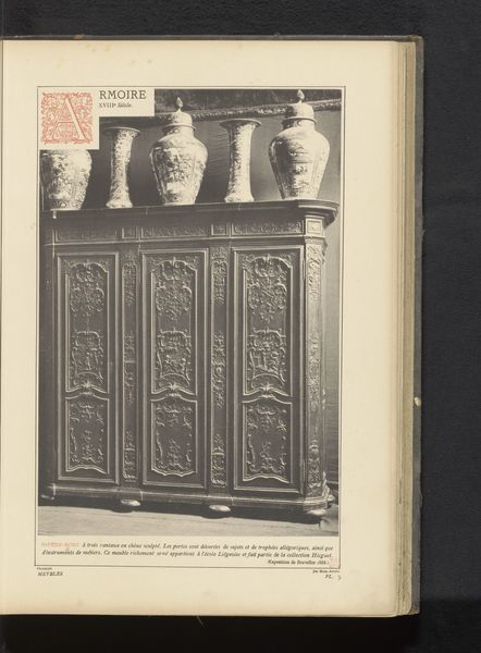 Editor: This is a photograph of the Reliquary Shrine of Saint Servatius in the Basilica of Saint Servatius in Maastricht, taken sometime before 1887. It seems to be a print with a photograph adhered to it. What strikes me most is the density of detail – every surface seems covered in intricate relief work. What are your initial thoughts on this piece? Curator: Indeed. Focus upon the deployment of visual elements: relief sculpture, specifically, governs our apprehension. The work exhibits a preoccupation with hierarchal organization, segmented by rigorous vertical and horizontal lines. Observe how each distinct panel is densely populated with figures rendered in a somewhat flattened, stylized manner, indicative of a pre-Renaissance aesthetic sensibility. The consistent depth across panels demands investigation into the conceptual rather than strictly representational properties of this object. What is emphasized through form? Editor: It seems to be emphasizing the divine through complex symbolic arrangements. The formal divisions create smaller narratives, and it's hard to tell what these mean. The verticality and density seem like a visual manifestation of faith. Would you agree? Curator: Precisely. Semiotically, the consistent application of depth signals importance. Absence of depth removes individual autonomy; they serve a divine goal in faith and life. Further, the photograph's monochromatic nature encourages emphasis upon the materiality and texture, calling for appreciation for sculptural volume independent of color. The object demands viewers analyze how light interacts with these forms, casting complex shadows that further enhance visual drama. Editor: That's fascinating. The emphasis on form over colour does change how I view the details. Instead of trying to decode everything immediately, I can appreciate the craft and organization itself. Curator: Form directs us to consider function. One must carefully study all attributes—the distribution of symbolic visual vocabulary across this work and how this object communicates both intention and faith. Editor: Thank you. Thinking about it that way makes the image both less chaotic and far richer in terms of the artist's decision-making.