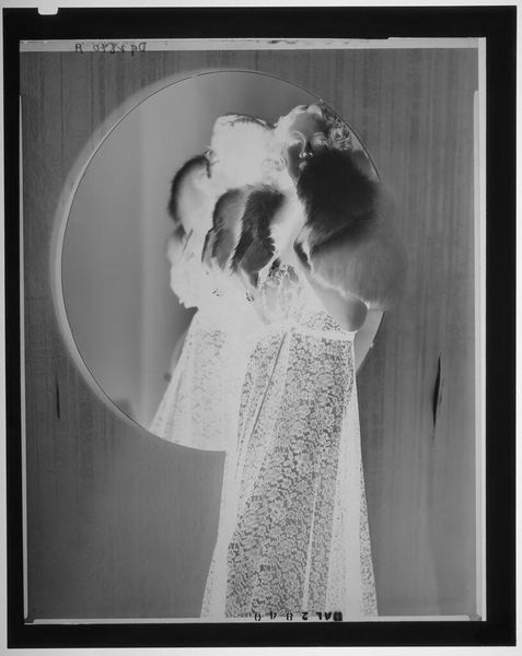 Curator: This intriguing photograph by Lucian and Mary Brown, currently held at the Harvard Art Museums, captures couples dancing at what seems to be a rather fancy party. Editor: It's striking, isn't it? The ghostly figures against the bright background... it almost feels like a dream or a memory. Curator: Given the apparent elegance of the dresses and suits, it would be interesting to know where the materials were sourced, and who was involved in the labor behind their production. Editor: The dancing couples certainly evoke images of social rituals and courtship. And, look closely: are those decorative cupids hanging in the background? Curator: Yes, indeed. The negative’s reversal of light and dark underscores the often-unseen processes involved in photographic reproduction, a dance between exposure and development. Editor: The cupids, set against the dancers, subtly connect romantic love with a sense of playfulness and innocence, a timeless association. Curator: I’m left wondering about the social stratification on display, the economics of leisure represented here. Editor: Ultimately, the image speaks to enduring themes of love, celebration, and social connection.