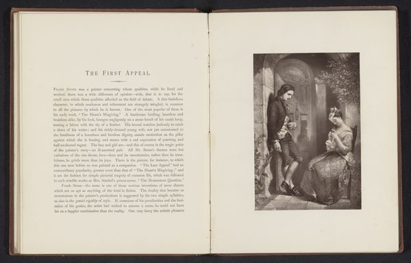 Editor: Here we have a photo reproduction of a print made before 1871, titled 'Fotoreproductie van een prent naar een schilderij, voorstellende een echtpaar loopt een kerk binnen,’ or 'Photoreproduction of a print after a painting, depicting a couple walking into a church’. The high contrast immediately caught my eye. What stylistic elements stand out to you? Curator: What I observe is a structured arrangement that draws attention to the threshold. Note the way the artist uses light and shadow to frame the figures. This formal element emphasizes the architectural divide—how does it modify your interpretation? Editor: I see it now! The bright figures contrast so starkly with the dark foreground and create depth and draw us toward them. How does the setting alter your perception? Curator: The architecture is functional. Note how the converging lines direct the gaze. The setting transforms it into a narrative device. Now, let’s look at the tonal variation. Notice the gradients, the shifts from light to dark, what effect does this accomplish for you? Editor: Well, there are gradients that create highlights on the main figures and they help them stand out but are any details, perhaps in the texture or composition, of significance to the setting? Curator: Absolutely! Notice the geometric rigor: rectangular shapes juxtaposed with archways and with rounded hats, emphasizing a compositional balance. How might this speak to the meaning? Editor: The couple seems to be balanced between these shapes. With the light around them I see them more clearly now. So would you say that the artist is interested in drawing attention to both human structure and architectural detail? Curator: Precisely, the artist appears primarily occupied with these inherent structures, arranging shapes and lines to achieve balance and direct visual attention. The setting is almost like a stage. It is less about narrative detail, more about pictorial syntax. Editor: I hadn't considered looking at it from that point of view. That adds another dimension to it!