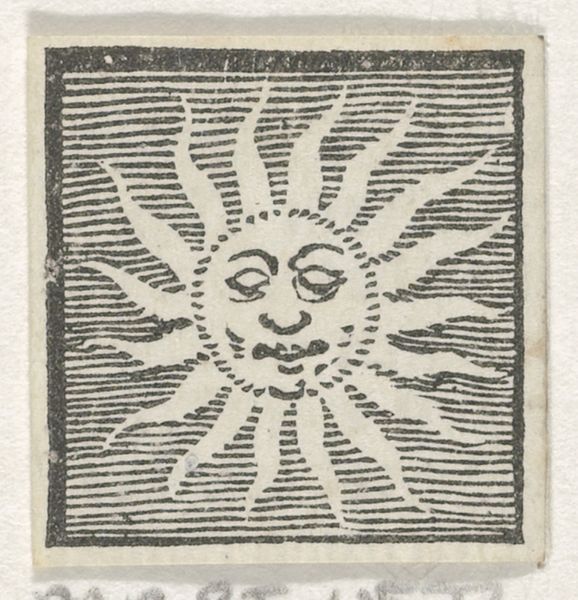 Curator: Well, it's quite striking. Very graphic. I immediately think of early scientific illustrations, maybe something from a botanical text. The high contrast feels very decisive. Editor: That's interesting. I see this object more in the context of its time. This is a title page fragment from 1616, made by Claes Jansz. Visscher. It was intended for "Illumination Art-Book," which focused on the art of illuminating texts. The piece is held in the collection of the Rijksmuseum. Curator: Illumination, right. It’s intriguing to see such a sharp, almost mechanical aesthetic associated with something we typically think of as delicate, like manuscript decoration. Editor: It speaks to the democratization of knowledge and art happening at that time. The printing press was facilitating the broader distribution of artistic techniques. This engraving would allow for the standardization and dissemination of illumination principles. Curator: Absolutely. And what about this recurring symbol? This head of the Sun, wreathed in emanating light, what is the origin and cultural continuity that you can speak on? Editor: Ah, this anthropomorphic sun isn't unique, but within the context of a how-to guide for illuminating, it may not just signify general enlightenment but the illumination of the mind that occurs when one takes the creative, illuminating path. A metaphor, essentially. Curator: The horizontal lines disrupt the naturalistic expectation and give it an abstracted effect. The face emerges from this pattern of horizontals—this symbol merges the universal with the codified rules of craft, offering itself up as both sun and the embodiment of creative application. Editor: So in considering the visual elements, how does it challenge what came before and pave the path toward something new, particularly relating to artistic instruction? Curator: It almost proposes a new way of looking, not just at the world, but also at the instruction and creative process itself, shifting from divine inspiration toward practical, reproducible knowledge. A revolutionary concept through this image of symbolic transformation! Editor: And hopefully, in a gallery visitor seeing this image, they begin to understand just how profound the proliferation of easily reproduced imagery really was to our understanding of art. Curator: Precisely. This small piece is an expansive point for thinking about the relationship between knowledge, art, and society.