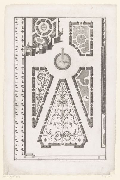 Curator: Ah, look at this beauty! We're examining "Forestilling på den ved Holstenhuus nye anlagde Have tegnet af G. D. Tschirscke, Bÿg-mester. Anno 1753," a cityscape from the 18th century. The artist, Jonas Haas, rendered this view using printmaking techniques, specifically etching and engraving. What's your take on it? Editor: Whoa, okay. Immediately, I see obsessive order, like a meticulously planned ant farm. But rendered with such fragile lines; the mood feels almost… melancholy, even with all that geometric rigor. It's like a lost civilization map! Curator: That melancholic feel resonates. This cityscape, representing a garden, speaks to the deep human desire to control nature. We impose geometry—squares, circles—onto organic forms, a powerful symbol of dominion. And this impulse reveals itself throughout history. Editor: Absolutely! And this piece captures a specific moment: this “Holstenhuus nye anlagde Have” - the title itself breathes old-world propriety. But the etching! It allows this ghostly image to emerge; it makes me question the very concept of lasting control or imposed order. It has vanished, that world... except here on this frail surface! Curator: Exactly. What we perceive now—the fragility, the melancholy—becomes layered upon the initial intent of celebrating the garden's design. This artwork's power lies in reminding us that memory and physical representation morph through time, embodying new meaning for each new beholder. The garden lives now within the network of meaning the etching represents. Editor: I love how you framed that. A static depiction, brimming with intent, constantly shifting its face for new audiences. If an image embodies history's fingerprints, this one carries a full handprint! Looking at this… now I wonder about the people who walked those meticulously drawn paths! What would they make of my seeing it this way? Curator: As custodians, we too shift perspectives when new interpretations arrive. In studying a symbolic order that the garden and print represent, and considering the layers of emotion revealed, both memory and intention may breathe as one. Editor: Precisely. Beautiful piece—so many stories buried in the ink. Thanks for revealing a little bit.