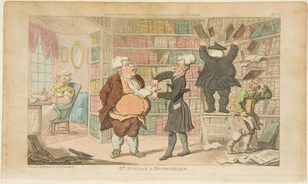 Editor: This is "Dr. Syntax and Bookseller," an aquatint print by Thomas Rowlandson from around 1815. It depicts a rather chaotic scene inside what appears to be a very full bookstore. I’m struck by how exaggerated and caricatured all the figures are. What kind of social commentary do you think Rowlandson is making here? Curator: This caricature allows us to engage with debates around class and access to knowledge in early 19th-century England. Note how Rowlandson employs exaggerated physical features - the bookseller's rotund figure versus the gaunt Dr. Syntax - to comment on societal hierarchies. This contrast implicates themes of intellectualism versus commercialism. What does this scene suggest to you about the role of literacy and learning in shaping social identities at the time? Editor: So, the visual contrasts aren’t just for comedic effect; they’re actually highlighting social inequalities? The struggling man atop the ladder and the well-fed bookseller visually reinforce that message, now that you mention it. Curator: Exactly. The act of acquiring knowledge, represented by the falling books, wasn’t a neutral pursuit. It was intertwined with economic and social capital. Rowlandson's prints were widely circulated, so how might this scene have resonated with contemporary audiences from various social strata? How do you think it plays into Romantic ideas of individualism and satire? Editor: I see. So it’s both entertaining but also subtly critical. I hadn't considered the accessibility aspect before; I was just focusing on the funny faces! It makes you wonder who could afford books, and who was actually doing the reading. Curator: And how the perception of these roles were defined and performed! Hopefully this print offers a rich landscape to reflect on the evolving interplay between identity, class, and knowledge consumption.