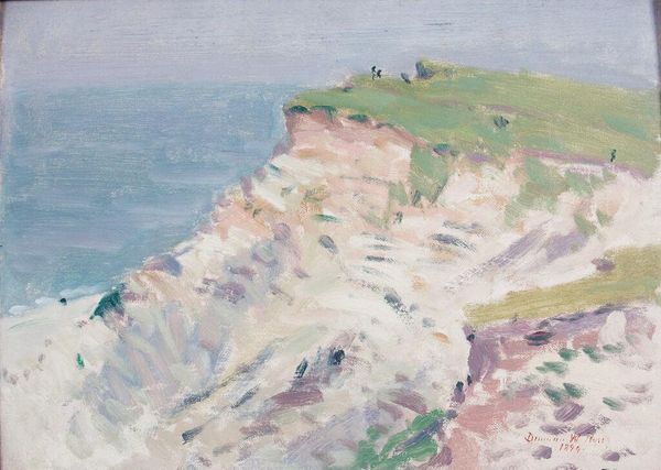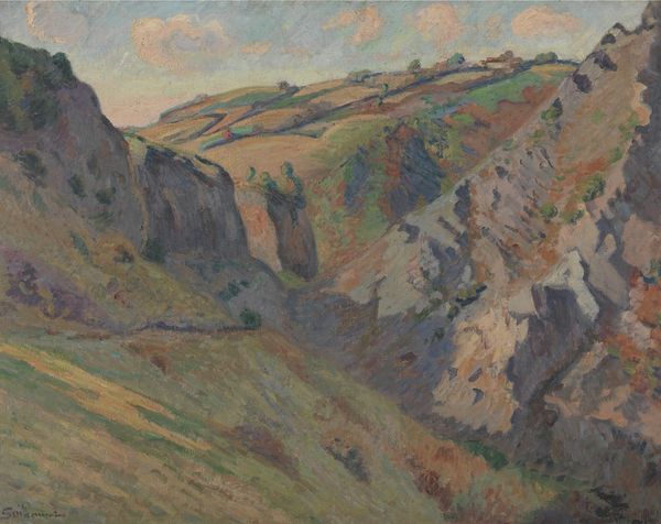 Editor: Here we have Carl Moll's *Donauansicht*, or *View of the Danube*. The textures look really rich; it almost feels like I can see the brushstrokes building up the hillside. How do you approach a piece like this? Curator: Immediately, I'm drawn to consider Moll's working conditions. Look at how he applied paint in visible layers. What type of brushstrokes can you see, and what type of brush do you imagine Moll was using? Are those deliberate marks made to depict materiality of the landscape or spontaneous expressions of individual craftsmanship, a sign of alienated labor within the commodified art world? Editor: It's interesting to think about the 'labor' of the artwork so directly. What about the commercial aspect; how did these constraints effect his craft? Curator: Consider how the surface tension of the medium – presumably oil – dictates his application of pigment, then ponder on the broader economic systems that fostered the painting and, ultimately, the price society places on this work today. How accessible was that kind of paint at this time, and who benefitted from its manufacturing? Also what effect has industrialisation along the Danube riverbank affected the community represented? Editor: That definitely changes my perspective! I was caught up in the aesthetic qualities, but now I'm wondering about the social context. Curator: Exactly. Instead of just viewing the landscape, question its making, and the systems, like galleries, that keep its production going. Does examining it from a materialist position change the reading of it? Editor: It does! It goes from being a nice landscape to being evidence of complex material and economic relationships, something much deeper and interconnected. Curator: And perhaps reveals underlying narratives about labor, consumption, and our relationship with the environment and art itself.