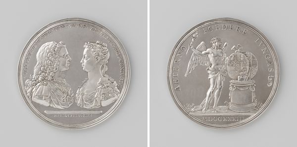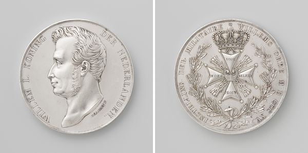 Editor: Here we have a metal relief sculpture called "Tiendaagse veldtocht, overwinningen bij Hasselt en Leuven, ter ere van Willem I Frederik, koning der Nederlanden" made in 1834 by Louis Royer. It depicts a regal profile on one side and a seated, almost Grecian figure on the other. The overall impression I get is one of power and historical importance. What do you see in this piece, considering its context? Curator: Well, this piece exists within a complex matrix of power, national identity, and historical narrative. While seemingly neoclassical, it's deeply entrenched in the construction of Dutch national identity following the Belgian Revolution. It isn’t just a celebration of Willem I; it's a visual assertion of Dutch dominance after a period of instability. Look at the allegorical figure; that’s not simply “Grecian influence,” it is drawing on a very specific language of empire, appropriating classical ideals to legitimize a contemporary regime. How does that visual vocabulary reinforce certain power structures? Editor: So the classical imagery isn’t just aesthetic; it's actively communicating something about Dutch authority and legitimacy? I guess it's using the past to validate the present. Curator: Exactly! It uses the weight of history – or a very selective *interpretation* of history – to suppress the nuances of the present. It's important to question whose history is being told, and for what purpose. For example, how might someone from Belgium, viewing this today, interpret its message compared to someone from the Netherlands? Does the relief feel neutral to you? Editor: Definitely not neutral. I see now how it's less about objective history and more about solidifying a particular national narrative, and how that visual language plays a critical role. This isn’t simply an art object; it’s a political statement cast in metal. Curator: Precisely! It encourages us to examine not only the “what” but also the “why” and “for whom” behind its creation and its continued display. By understanding that, we challenge these visual claims to historical truth and destabilize those assertions of power. It's more than meets the eye. Editor: It gives a lot to think about in terms of art, identity, and political messaging.