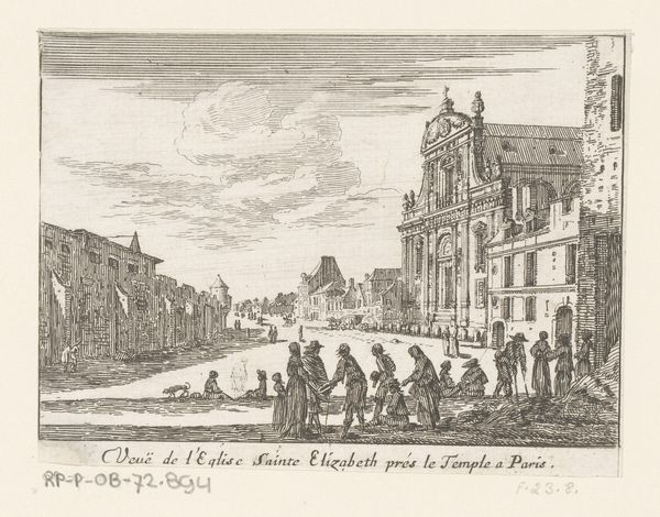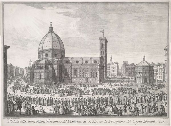 Editor: This engraving, titled "Veuë de la place et de l'Eglise de S. Piere et du Palais du Pape appellé le Vatican," created between 1640 and 1660 by Israel Silvestre, offers a sweeping view of St. Peter's Square. I’m struck by the bustling activity depicted – the crowd feels like a political statement of some kind. What are your thoughts on this print? Curator: That's an astute observation. Beyond its architectural depiction, this engraving offers a powerful statement about papal authority and the urban landscape. Consider how Silvestre uses the relatively new medium of reproducible print. He circulated these images to broaden knowledge of papal power beyond Rome. The sheer scale of St. Peter’s, emphasized by the bustling crowds, conveys a message about the global reach of the Catholic Church. Does the position of the viewer impact this power dynamic? Editor: It feels like the artist deliberately positioned us, the viewers, as if we are standing among the public, perhaps to include us in that feeling of awe. Curator: Exactly! It situates us within a particular social and political context. Now, think about the artistic choices here: the linear perspective, the details captured. How do these formal elements play into constructing that message of papal authority and public engagement? Editor: Well, the use of precise lines really emphasizes the grandeur of the architecture. It creates this sense of order and permanence, I guess reinforcing the idea of an unshakeable institution. The artist must be supportive of that agenda. Curator: Or working to create something for a certain clientele who desires to promote their point of view? Consider also the potential socio-economic backgrounds of those within the "crowd" --are we sure we are all meant to be in awe? How are we invited to look, and for whose purposes? These choices create a dominant narrative, but we must remain mindful of those historical erasures when approaching works like this one. Editor: I hadn't considered how those choices might be intentionally designed to assert dominance. Curator: Looking critically at who is included, who is excluded, and whose narrative is being privileged can reveal the subtle power dynamics at play. Editor: Thank you. That's a completely different perspective, and it gives me a deeper appreciation of the print. I'll certainly keep that in mind when studying other works of art in the future. Curator: And I appreciate you identifying the nuances of propaganda!