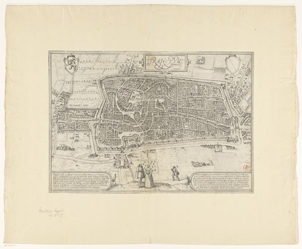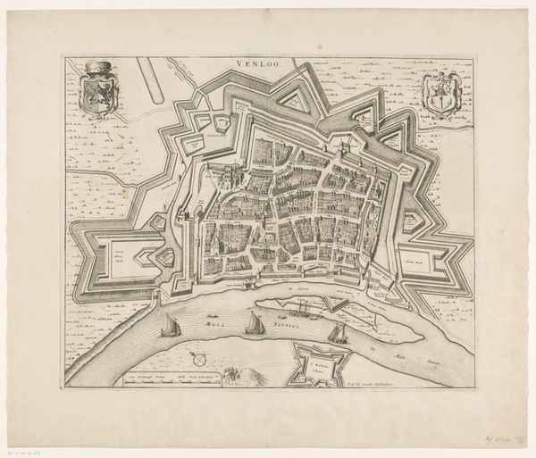 Curator: Let's examine this piece titled "Plattegrond Middelburg," dating circa 1657-1728, housed here at the Rijksmuseum. It's an engraving in ink on paper. Editor: It’s fascinating! It's such a detailed rendering, almost like an aerial photograph before planes were even invented. The intricate line work makes the whole composition so precise, even though it represents an entire town. What catches your eye when you examine this work? Curator: Note the interplay between order and chaos. The town's circular form and fortified walls offer a strong, defined structure. However, within this structure lies a complex web of streets and buildings. This tension is echoed in the varying line weights. What do you make of the areas where lines are clustered, creating darker masses, compared to areas of more open space? Editor: It seems the density of lines really emphasizes the important or populated parts of the town center, as well as the defensive structures. It's a clear visual hierarchy created purely through line and space. How do the different textures add to that effect? Curator: Precisely. The varying textures, achieved through hatching and stippling, delineate different areas - the built environment, the surrounding fields and waters. This is the picture plane organized into distinct units which create both contrast and harmony. Consider how the graphic elements combine to present the information of the town. It also prompts thoughts on cartography as a way to wield visual power. Does viewing the artwork at this level provide a heightened understanding, do you think? Editor: Yes, absolutely! Focusing on the composition really highlights how even a seemingly informational piece like a map uses artistic principles to communicate effectively and perhaps subtly convey messages of control and order. Curator: Indeed. Understanding the artist's structural choices helps to unveil layers of meaning beyond the merely representational.