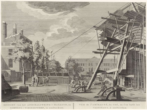 Curator: This engraving, dating back to 1696, is titled "Manier om materialen op te hijsen," or "Manner of hoisting materials." It comes to us from an anonymous artist. What's your initial take? Editor: Stark, in a way. It's all hard lines and sharp angles. The figures look like they are pieces in some monumental chess game, set against this hazy seaside background. Very… purposeful, I suppose. Curator: Indeed. Formally, note the etches forming the cloudscape versus the stark linearity defining the fortress architecture. It's all quite Baroque in its sense of movement and dynamism, even in such a constrained palette. We are examining not just a cityscape but a glimpse into the historical engineering methods used to build such fortifications. Editor: There's also this human element, isn't there? All those tiny figures toiling, dwarfed by the scale of the project. The engraving’s rendering of human labor feels, somehow, poignant. I can’t help but see a pre-industrial age version of Sisyphus here. Curator: Interesting, yes. Consider how the architectural framework mirrors this concept through lines of force and stress. The stark contrast embodies labour’s relentless pursuit against the immovability of structures. There’s also a dialogue at play between what endures and what is transitory. Editor: It strikes me as a reminder that every grand accomplishment comes at a human cost. Makes you wonder what these tiny workers thought as they were hoisting stone after stone... probably just wanted the day to be over, eh? Curator: A grounded perspective. And with the visual texture created through repetitive, linear engraving, this piece evokes that enduring essence very cleverly. Editor: Well, that's definitely given me a lot to think about—all these people putting in elbow grease to make something that lasts for centuries... kind of puts my afternoon plans in perspective. Curator: Precisely! A convergence between method and message, leaving us contemplating our role within the continuum of creation.