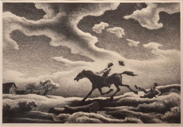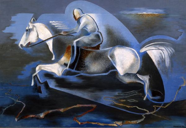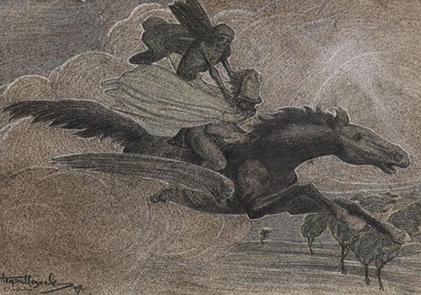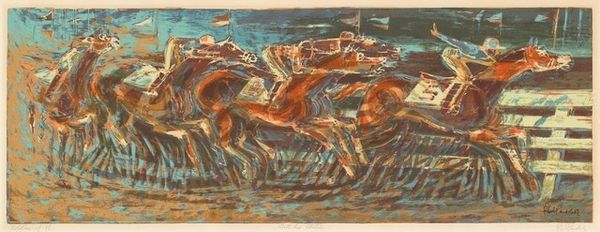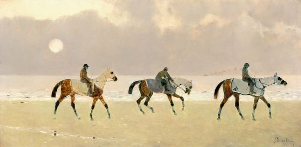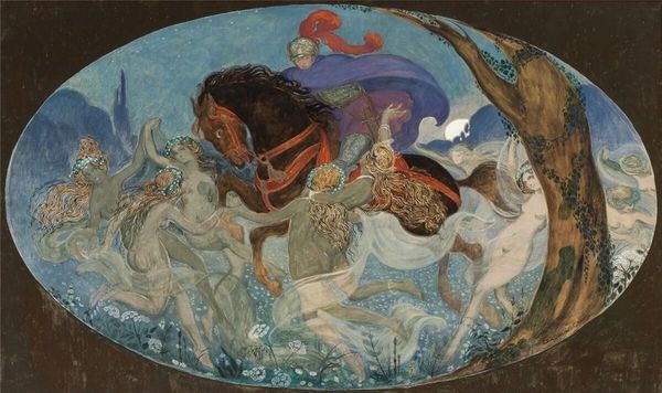 Editor: So, this is Walter Crane's "Neptune's Horses," painted in 1893. It's a watercolor piece, and I'm struck by how turbulent and energetic it feels. The horses emerging from the waves… it’s quite dramatic. What do you see in this work, and how do you interpret it? Curator: Beyond the immediate drama, I see a powerful statement about Victorian anxieties surrounding industrialization and societal upheaval. The raw, untamed power of Neptune and his horses can be read as a counterpoint to the rigid social structures and perceived dehumanization of the era. Editor: That's interesting. I was mostly focused on the mythology, but the context makes it much deeper. The waves, they almost feel like a force of nature pushing against something... Curator: Precisely. Consider Crane's involvement with the Arts and Crafts movement, a reaction against industrial production. How might this inform his depiction of Neptune, a god embodying primal, unbridled creativity? Do you think this is in line with other romantic interpretations? Editor: Maybe. The romantics glorified nature and ancient myths, so Neptune is very apt, but this angle is about a particular time in history. The movement to recapture craftsmanship makes me think about the role of art, too...as resistance. Curator: Absolutely. Crane's choice of watercolor, a medium associated with spontaneity and fluidity, further underscores this rejection of the rigid, mechanical world. The painting prompts us to consider the power of myth and the natural world as spaces of resistance against oppressive systems. Editor: I had no idea so much could be read from this scene! Curator: And it doesn't stop there! It serves as a vital touchstone, sparking dialogue between art history and contemporary socio-political realities, allowing for meaningful discussions around cultural identity, power dynamics, and potential pathways toward collective liberation. Editor: That's fascinating. I'll definitely be looking at art differently now. Thank you!