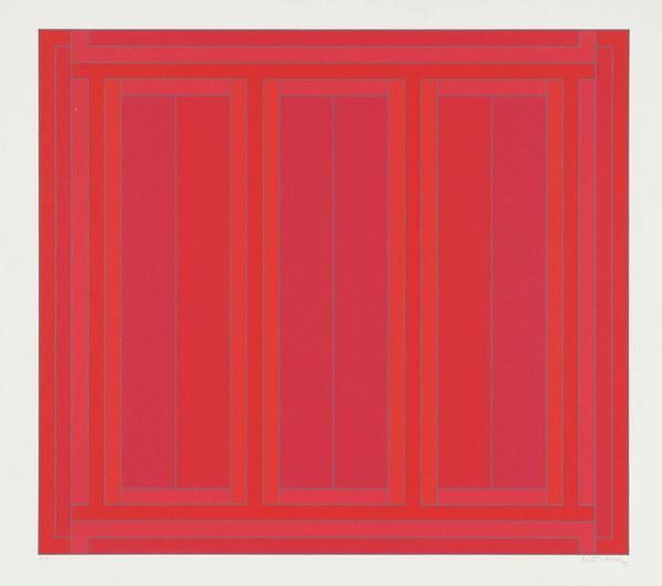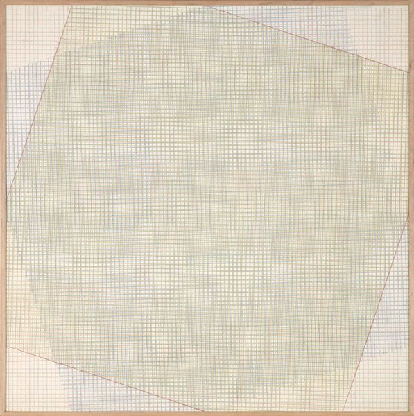 Curator: There's something so soothing about this untitled piece by Peter Stroud, created in the 20th century. It’s part of the Tate collection, a print featuring layered geometric forms in soft blues, browns, and yellows. Editor: It feels almost like a schematic, or maybe a floor plan stripped of all its architectural purpose and left with the bones of pure form. It's intriguing how the colours interact. Curator: Absolutely. Stroud was interested in how colour created spatial illusions, and here, the gentle shades create a subtle sense of depth, almost like looking into a hazy distance. The way the colors shift at each edge is so delicate! Editor: And that repetition, the way the shapes echo each other, feels almost meditative. I’m thinking about the legacy of formalism, how this stripping-down echoes broader social desires for order. Curator: Yes, there’s a calming structure to it, a feeling that everything is in its right place. But then, the subtle variations hint at something more organic, a gentle breath within the rigid lines. Editor: Thinking about minimalist aesthetics, this piece almost makes you consider how geometric forms could be considered a visual language for the powerless, offering structures of meaning amidst the chaos of everyday life. Curator: Perhaps it is about searching for some kind of peace within the chaos of our own thoughts. A welcome place for the mind to rest.